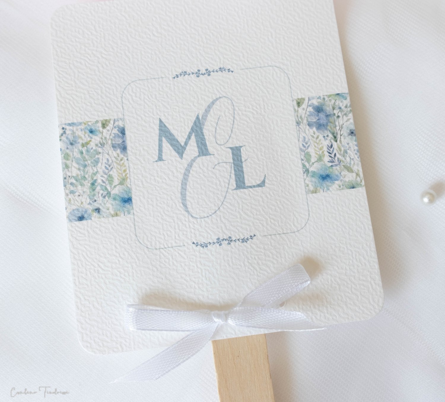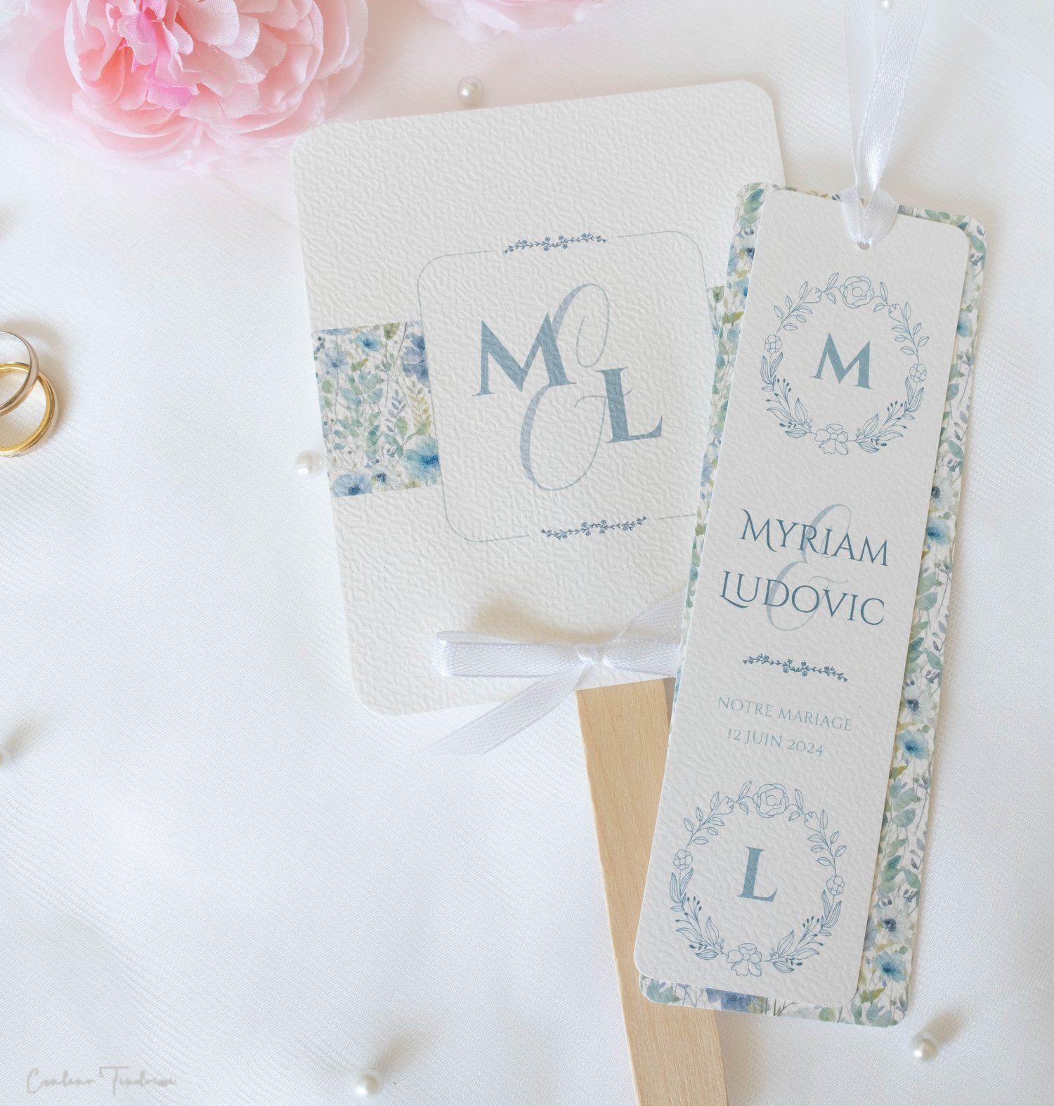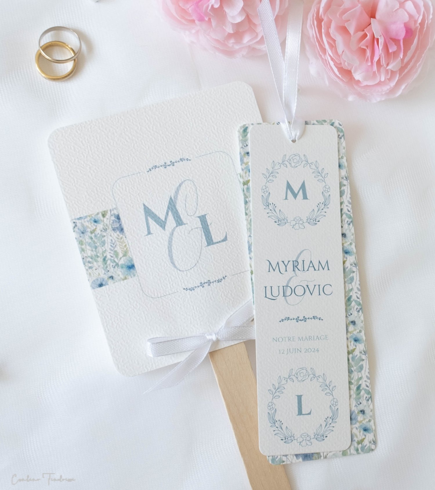 - Chaque éventail est constitué de deux pans collés dos à dos : le recto est orné de l'imprimé floral, ainsi que de vos initiales (modifiable pour tout autre inscription de votre choix, mot de bienvenue, remerciements... ) tandis que le volet verso comporte les détails de la journée. Le tout est relevé par un ruban de satin, de coloris au choix, apportant une touche de raffinement supplémentaire.