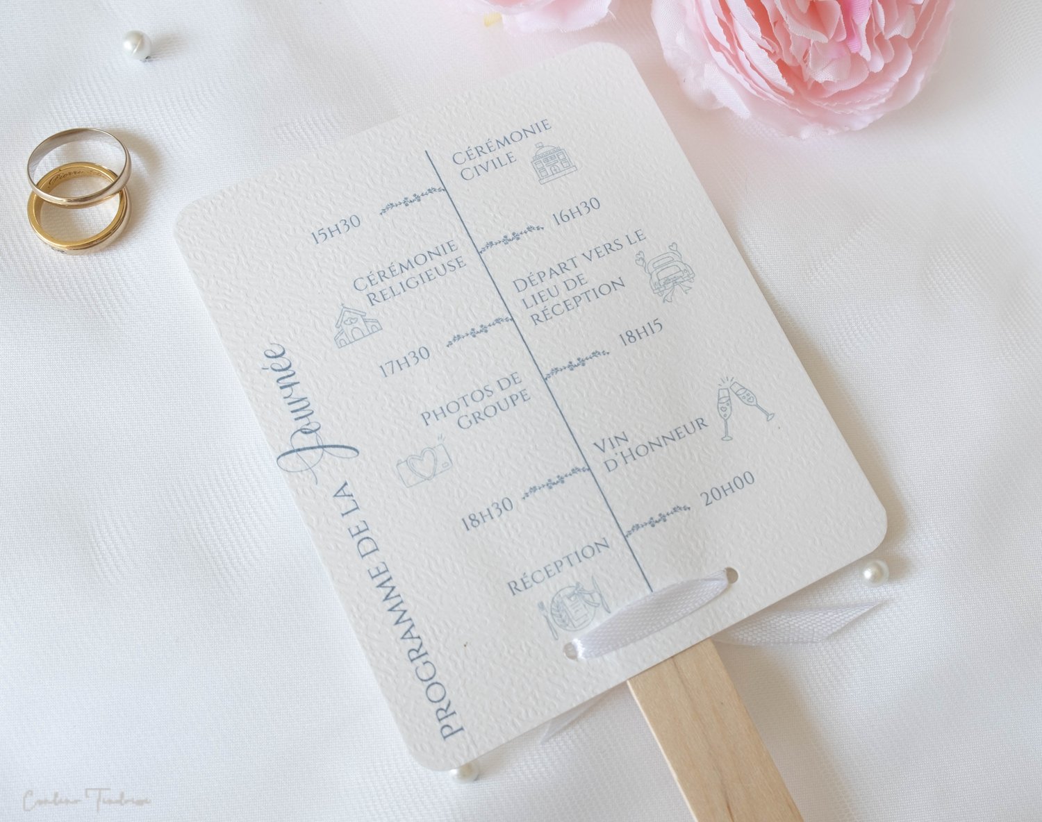 - Le format final du programme éventail, et de 12.5x10 cm environ, parfait pour être manié facilement par vos invités tout en apportant une touche élégante.