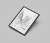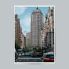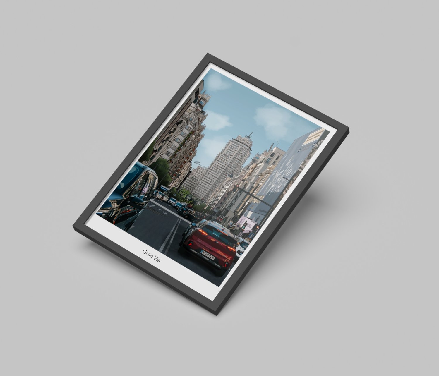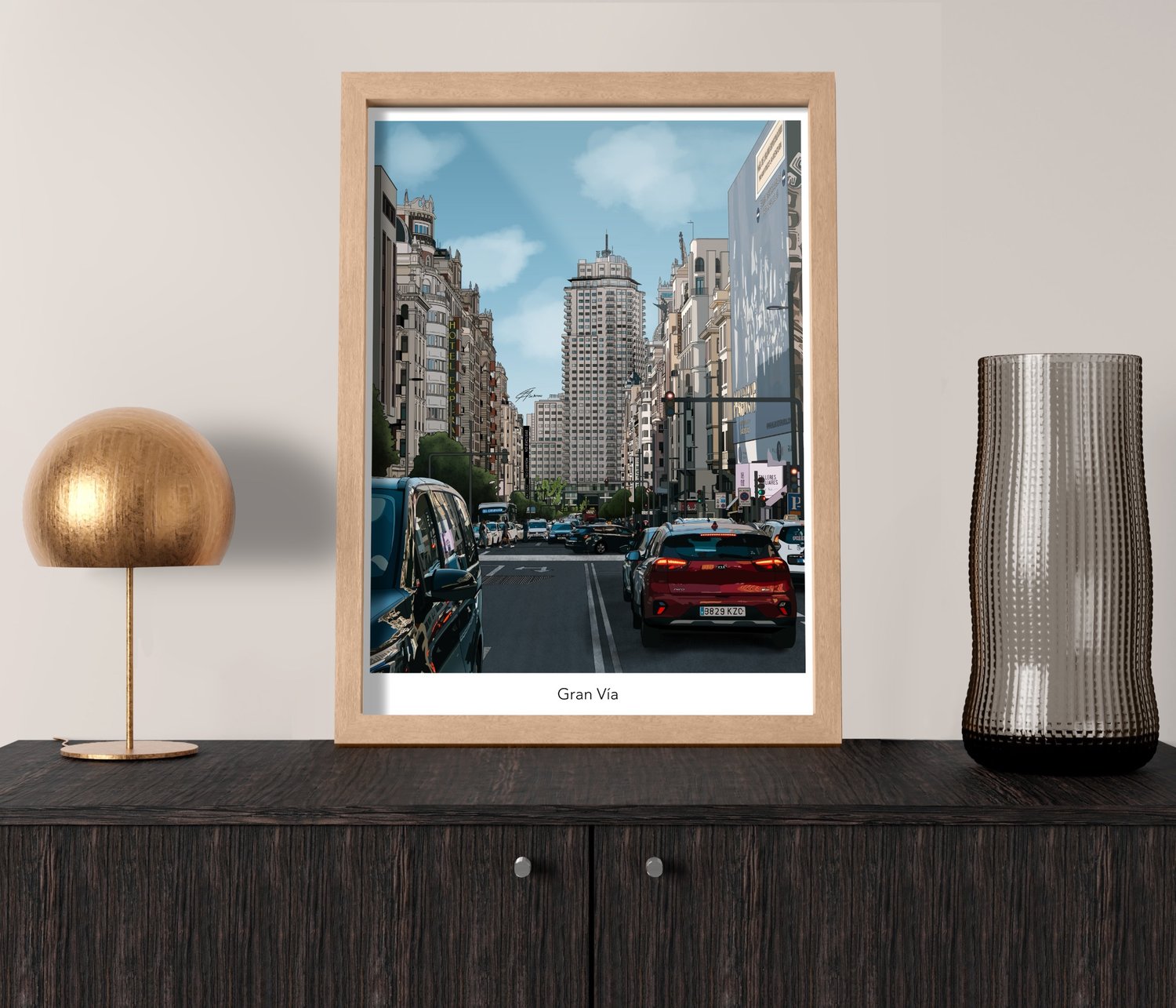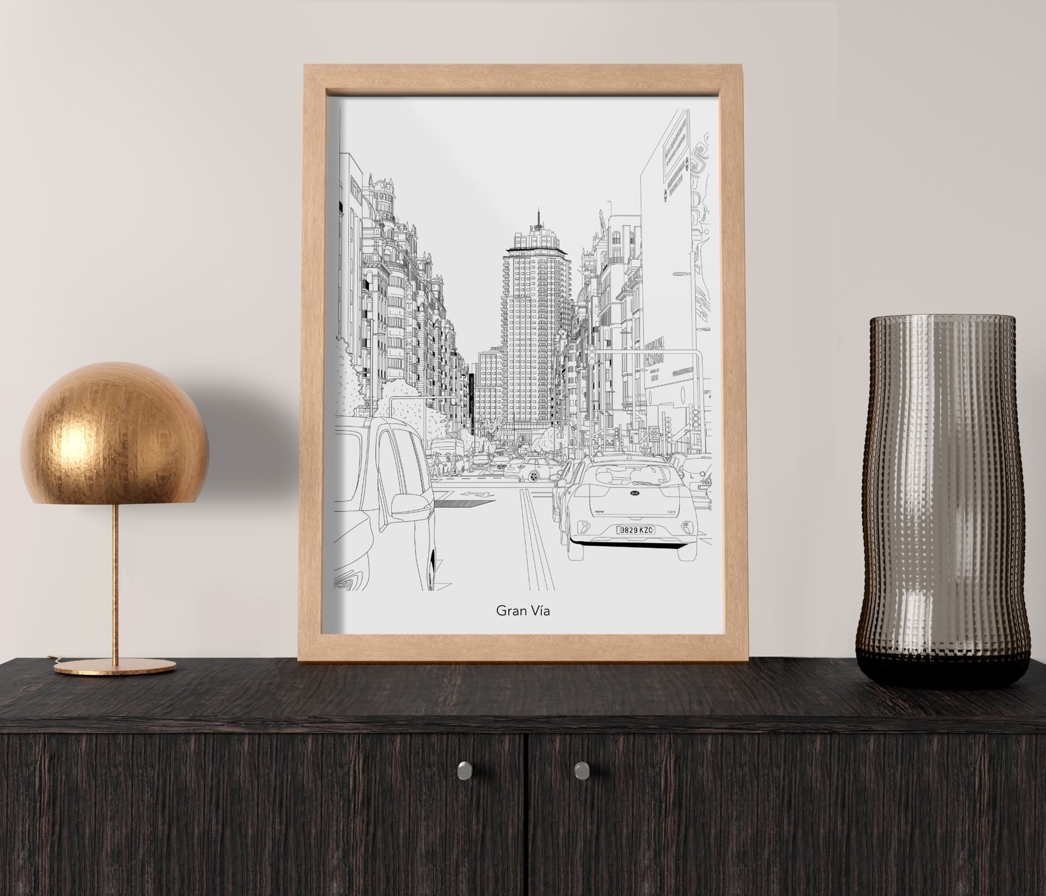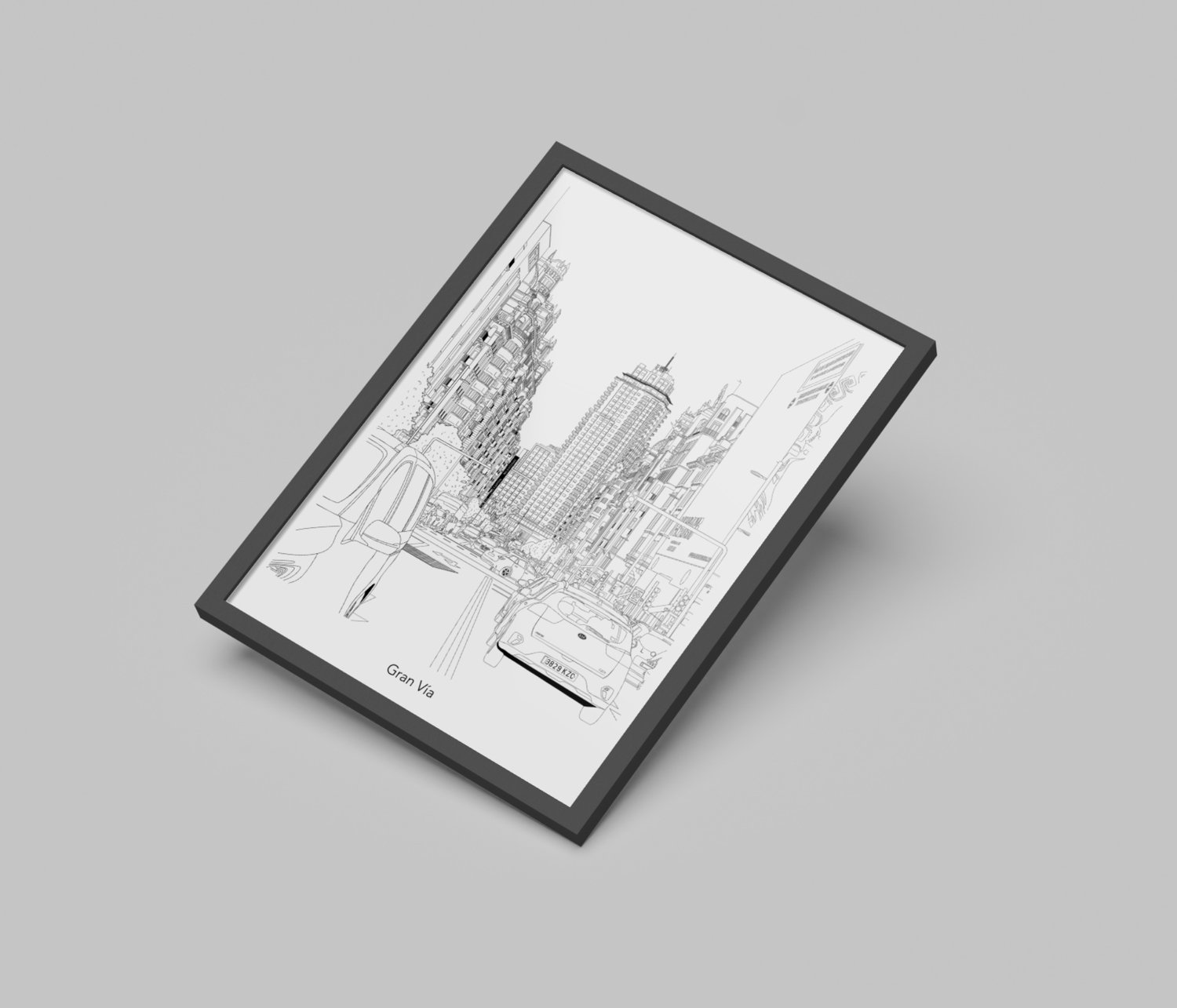 Vista ilustrada de la Gran Vía, mostrando edificios icónicos alineados con fachadas detalladas. Coches, peatones y rótulos comerciales añaden dinamismo, en una composición de trazos fluidos que capturan el bullicio madrileño.
