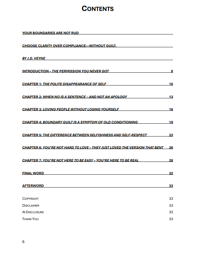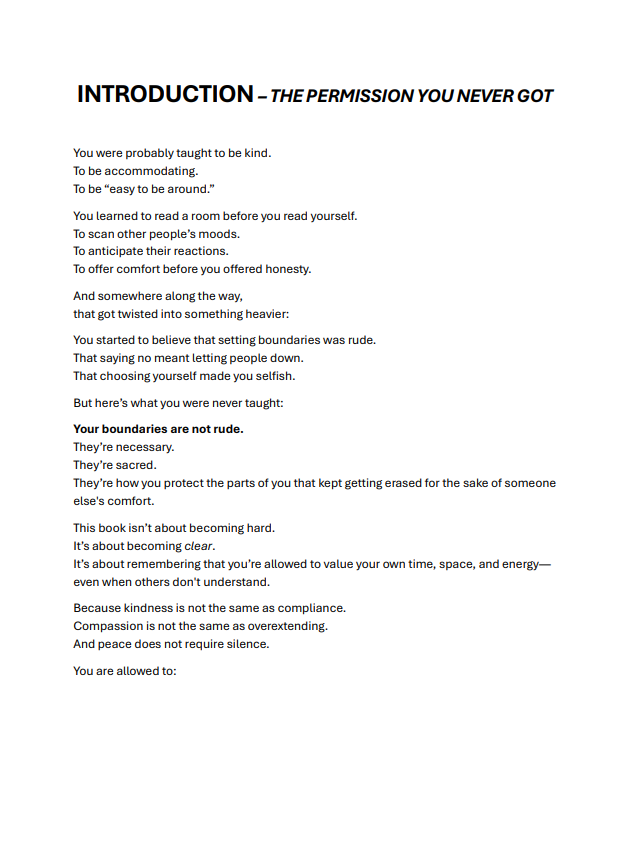 Your Boundaries Are Not Rude helps you stop performing “niceness,” say no without apologizing, and protect your energy without shrinking yourself. Short, high-signal chapters show the difference between selfishness and self-respect, why guilt is old conditioning, and how to love people without losing you.