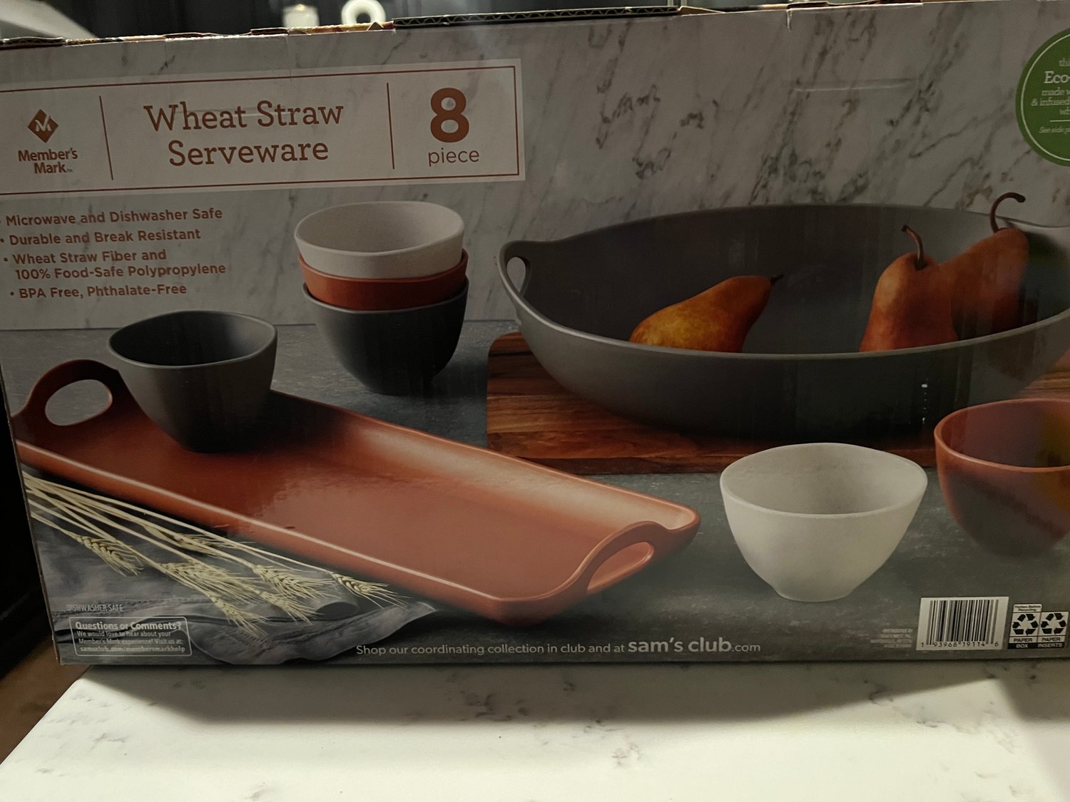 8-Piece orange Break-Resistant Wheat Straw Serveware Set Durable, break-resistant reusable serveware set Wheat straw fiber and 100% food-safe polypropylene Includes rectangular tray, oval serving bowl and six dip bowls Microwave and dishwasher safe BPA Free Set includes: 1 rectangular tray 1 oval serving bowl 6 dip bowls Dip bowl capacity 15.8 fl. oz.