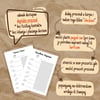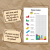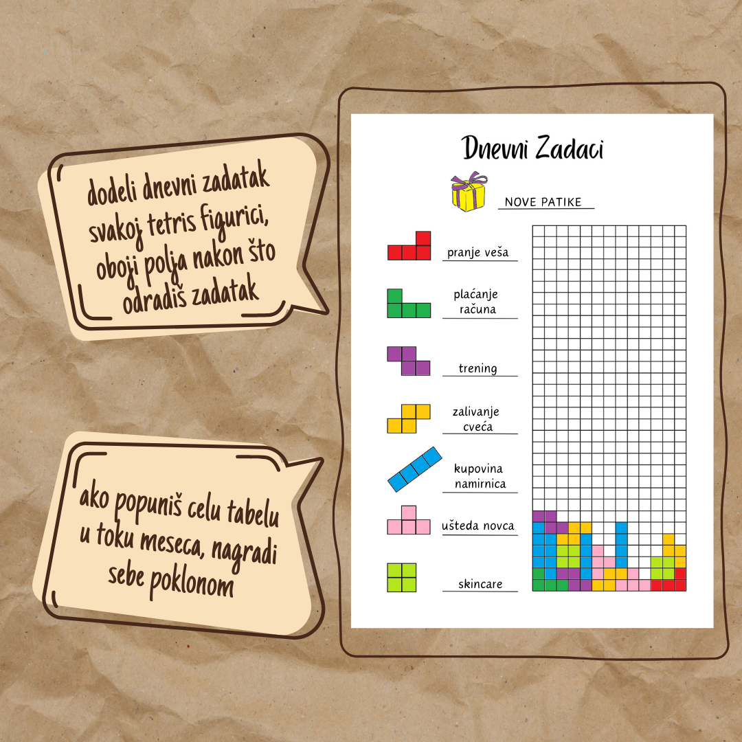 Dnevni Zadaci: Učini svakodnevne zadatke zabavnim pomoću ove stranice sa inspirisane Tetris igricom. Dodeli svakoj Tetris figurici određeni dnevni zadatak (kao što je plaćanje računa, kuvanje, čišćenje, itd.) i oboji svaki deo kada završiš zadatak. Popuni tako celu tablu do kraja meseca da i nagradi sebe poklonom koji ćeš na početku meseca napisati na liniji na vrhu stranice.