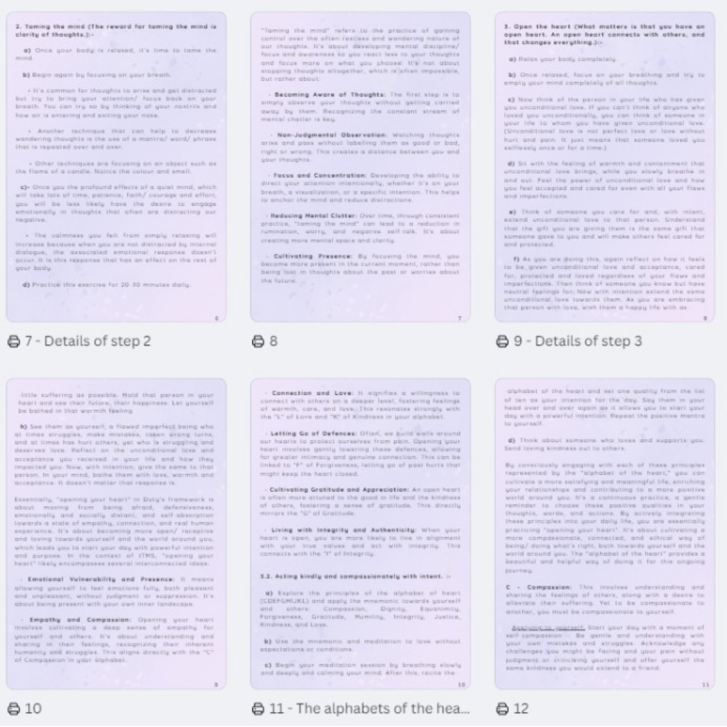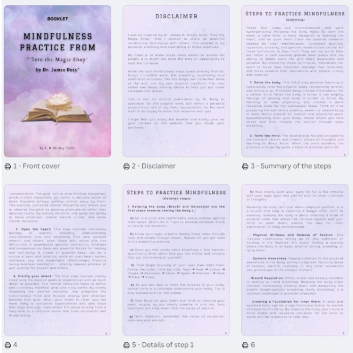 Inspired by Dr. James R. Doty's book, Into the Magic Shop, this booklet is a personal project designed to bring the book's incredible mindfulness techniques to a wider audience. I've summarized and rephrased the core practices to make them more digestible and accessible, especially for those who may not have the time to read the full book. You'll find a clear breakdown of the mindfulness steps, alongside new activities—including bingo tables—that I created to help you apply these lessons directly to your daily life. It's a resource born from my deep appreciation for the original work, created with the hope of helping you on your own journey.