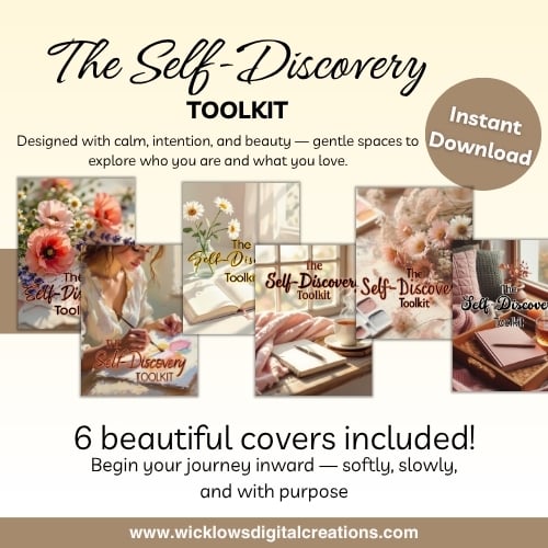 ✨ The Self-Discovery Toolkit is a 30-page guided workbook filled with calm reflection prompts, printable tools, and journaling pages to help you uncover your values, strengths, and purpose.