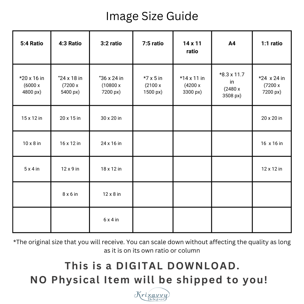 5:4 ratio : 20" x 16", 15” x 12”, 10” x 8”, 5” x 4”
