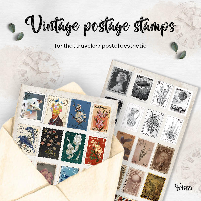 •Postage Stamps: classic postal designs for a traveler’s aesthetic.