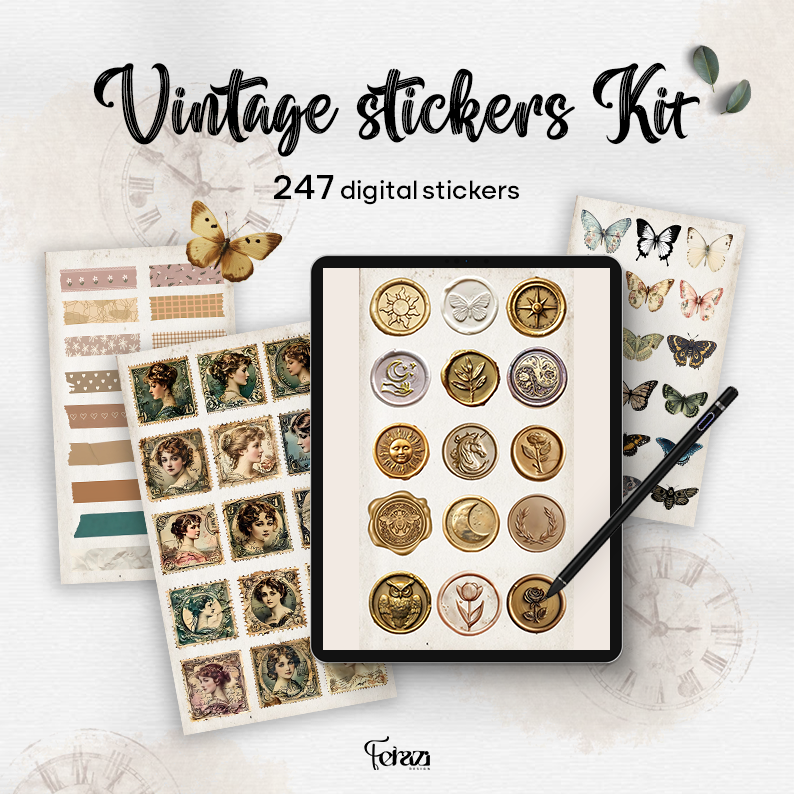 Transform your planner, journal or any digital projects with 247 beautifully designed vintage stickers.