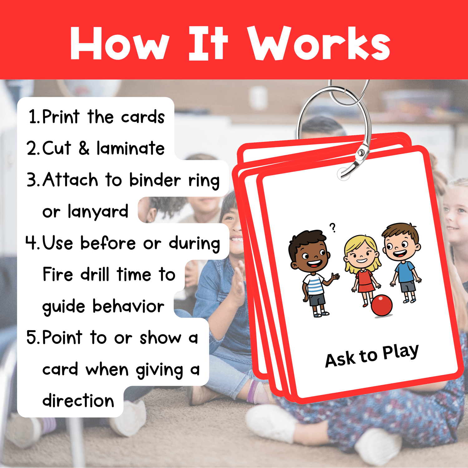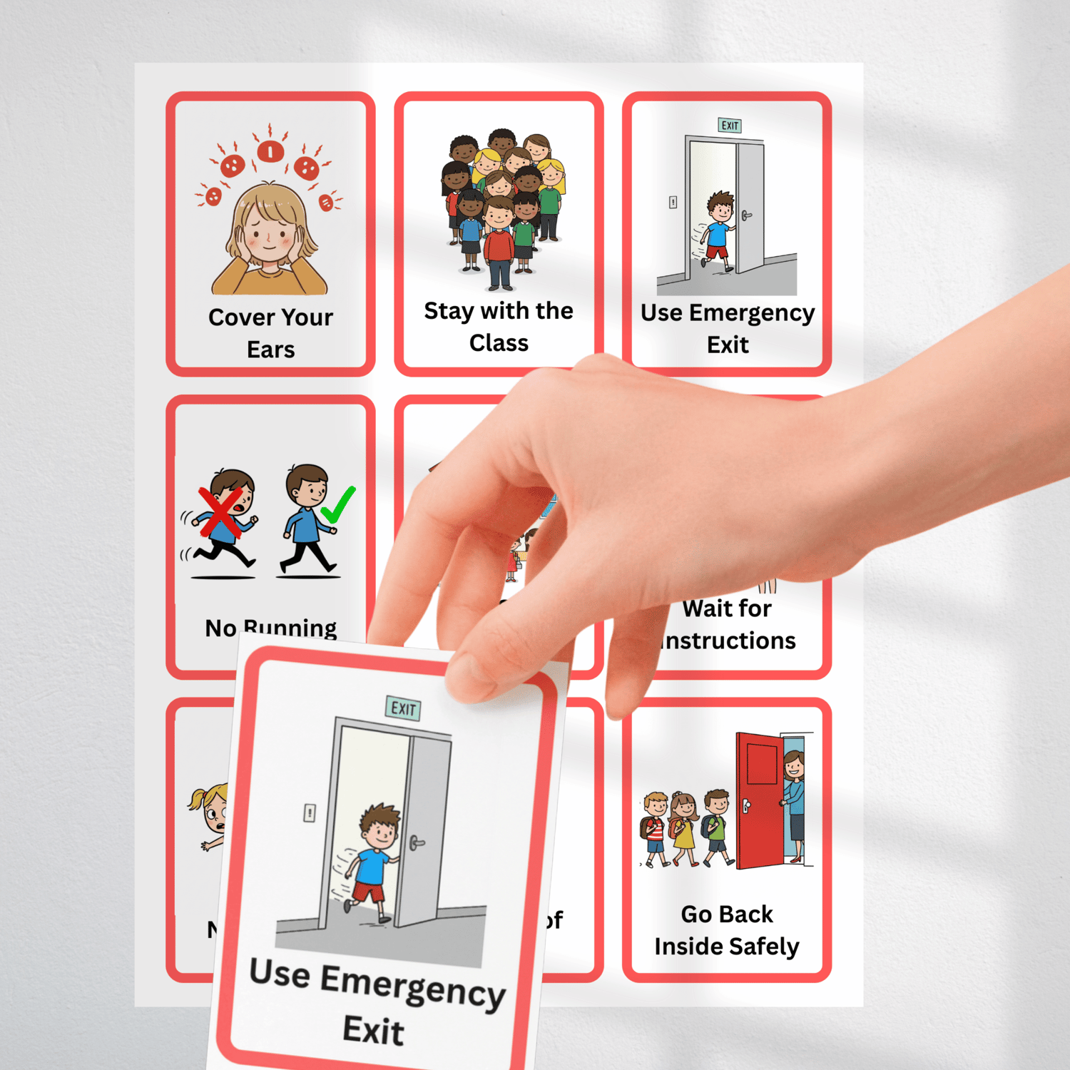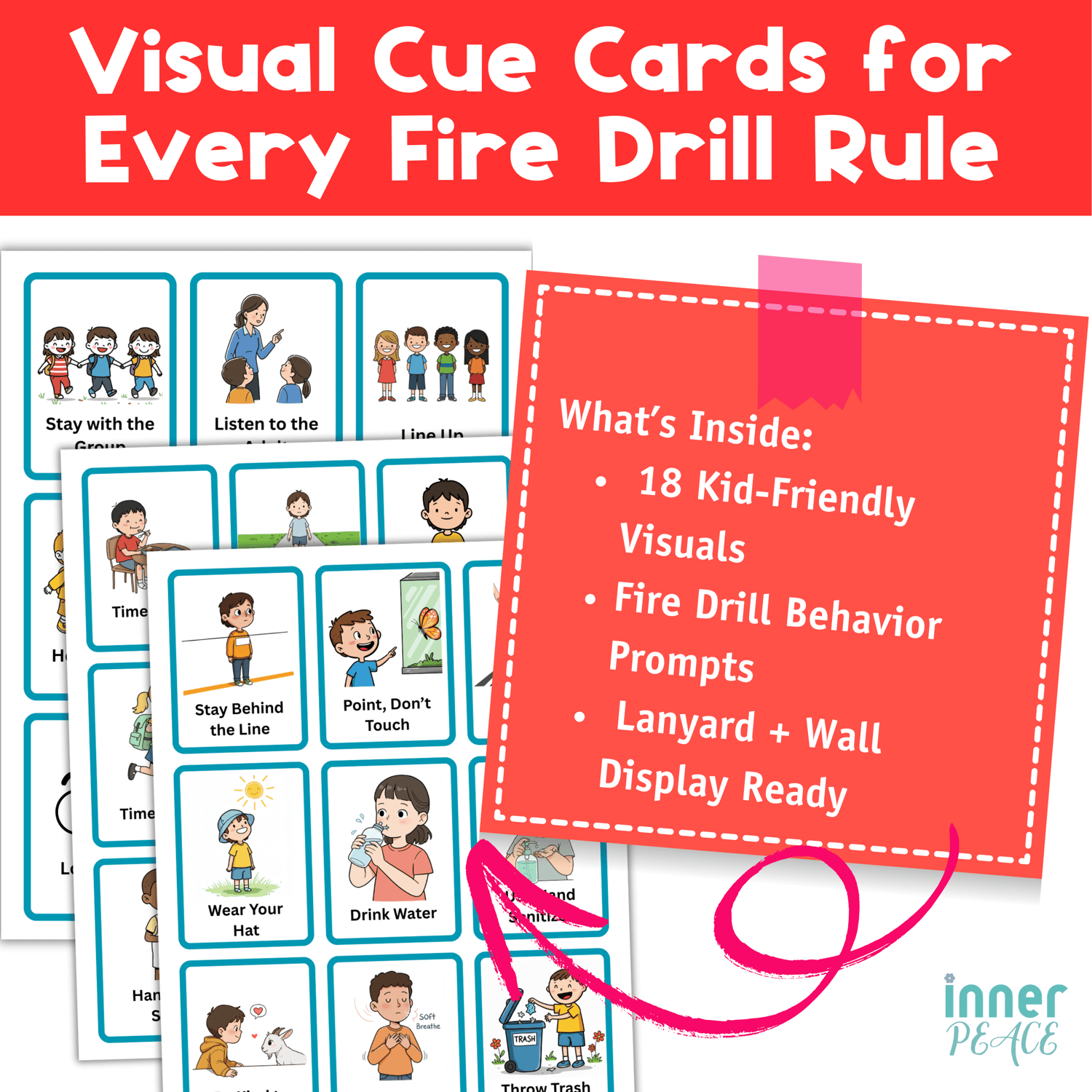 - 18 lanyard-sized visual cue cards for fire drill & safety routines