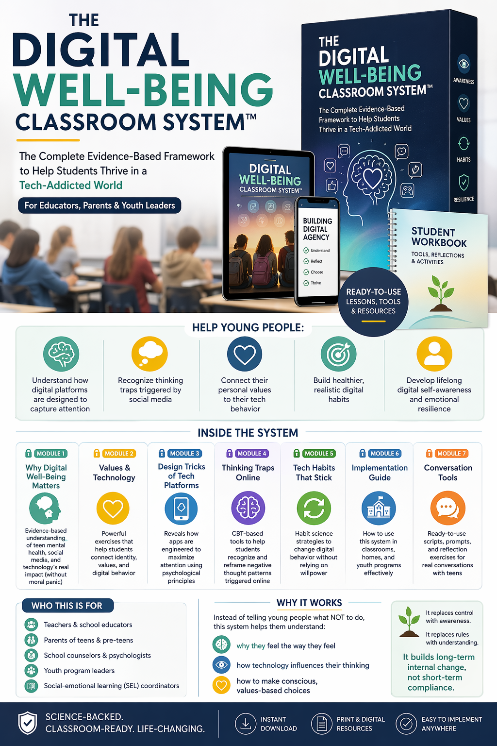 The Digital Well-Being Classroom System™ is a complete, ready-to-use framework designed to help educators, parents, and youth leaders teach young people how to develop real digital agency — without fear, guilt, or tech panic.