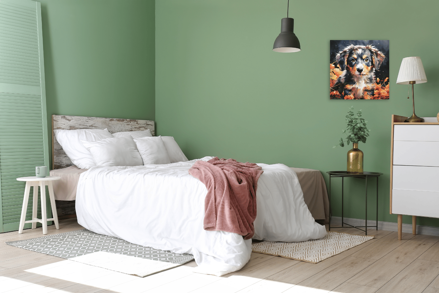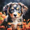 An adorable puppy, sitting calmly amidst a carpet of vibrant orange leaves that blanket the ground. Its soft fur, perhaps a mix of browns and creams, contrasts beautifully with the warm autumn foliage surrounding it. The puppy's bright eyes are wide and curious, exuding an innocent charm that captures the viewer’s heart. With its head slightly tilted, it seems to be lost in thought, perfectly embodying a moment of quiet contemplation. Sunlight filters through the trees overhead, casting a gentle glow on the scene and highlighting the puppy’s features. The scattered leaves create a cozy, inviting atmosphere, enhancing the feeling of autumn serenity. This delightful image evokes warmth and tranquility, reminding us of the simple joys found in nature and the companionship of a furry friend.