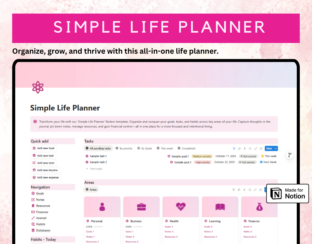 The Simple Life Planner is your all-in-one Notion system designed to help you organize, manage, and thrive across every area of life. It’s a holistic digital hub that brings clarity, structure, and balance — empowering you to live intentionally and productively.