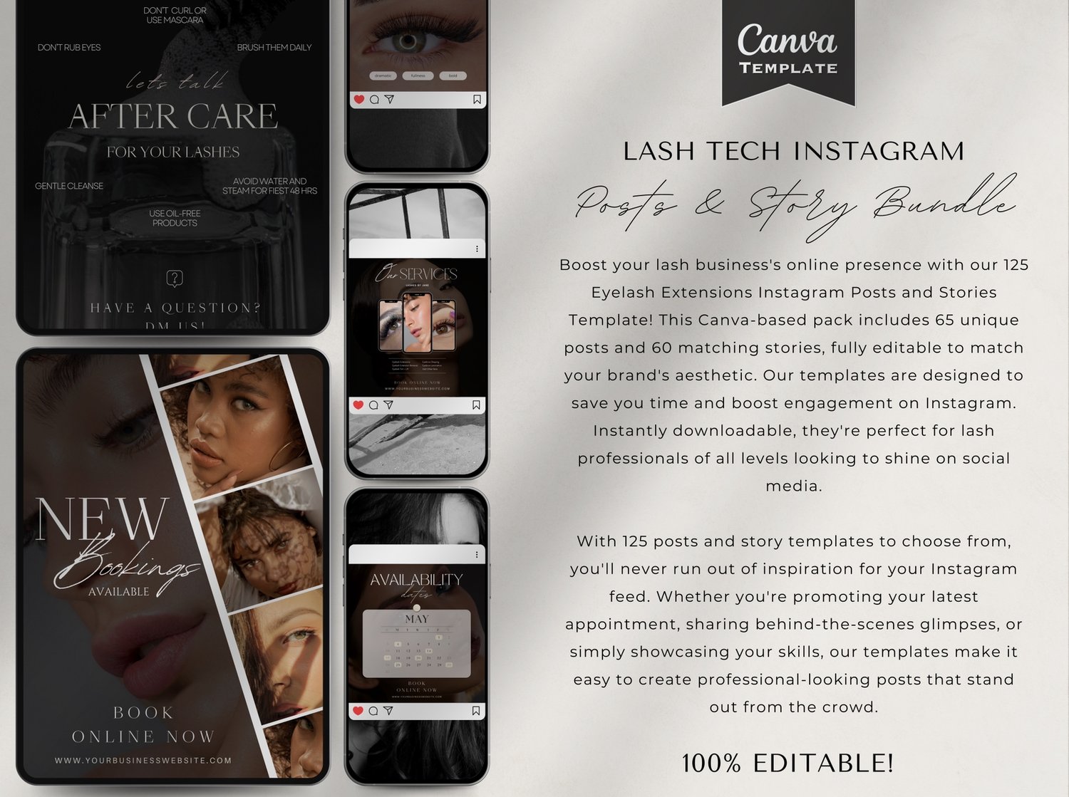 125 Lash Technician Instagram Posts & Story Canva Bundle - Black Aesthetic
