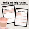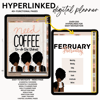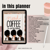 Featuring a cute and cozy coffee-themed design, this digital planner includes different sections for daily, weekly, and monthly planning.