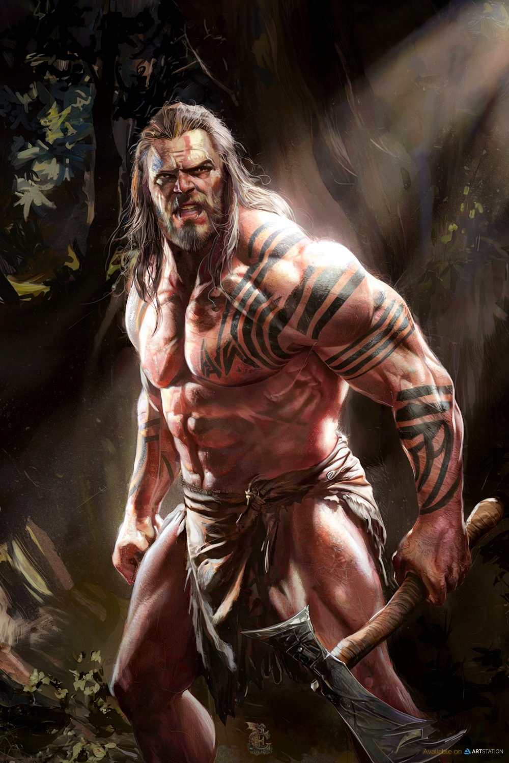 A fierce tribal warrior stands amidst the shadows of an ancient forest, his muscular body etched with sacred tattoos and illuminated by shafts of sunlight. Clad in animal hide and wielding a massive double-bladed axe, he roars with primal intensity, embodying raw strength and mythic power. πΏπ₯ The dense foliage and dramatic lighting evoke a sense of wild survival and ancient ritual. Perfect for fans of fantasy art, warrior mythology, and nature-infused epic storytelling. πΎππ³