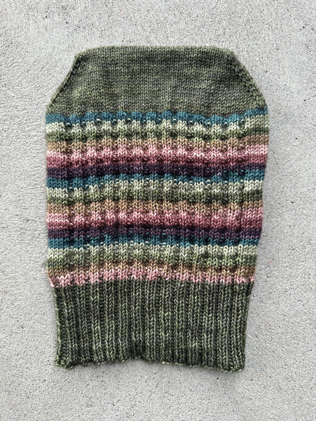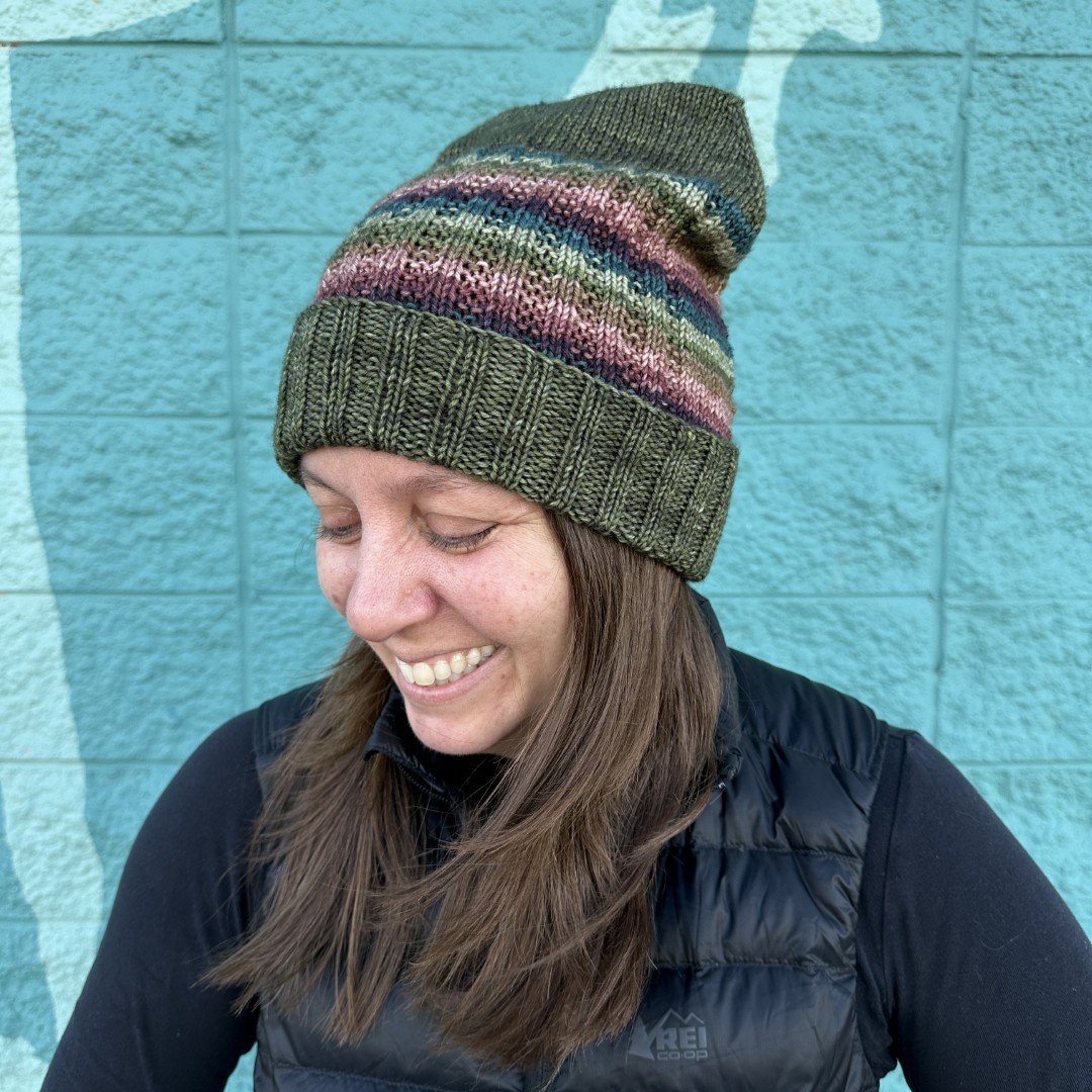Sample shown in Hibernating set (self-striping + tonal). Self-striping: 117 yd / 107 m (38 g); green: 96 yd / 87 m (31 g). Sample is Size 2 with folded brim.