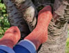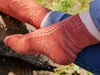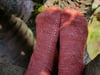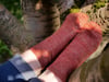 La version originale a été tricotée avec une base 75% mérinos, 25% nylon, 425 m pour 100gr, coloris rouille (teint maison par une amie).