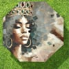 This stunning artwork showcases an African woman wearing a majestic crown adorned with emeralds and rubies, symbolizing elegance and power. Her peaceful expression, with eyes gently closed, exudes a sense of calm and grace. Large gold hoop earrings frame her face, while abstract brushstrokes in soft earthy tones create a textured, ethereal background. The image is displayed on an octagonal canvas, set against a vibrant green grass backdrop, further enhancing its regal and serene quality.