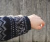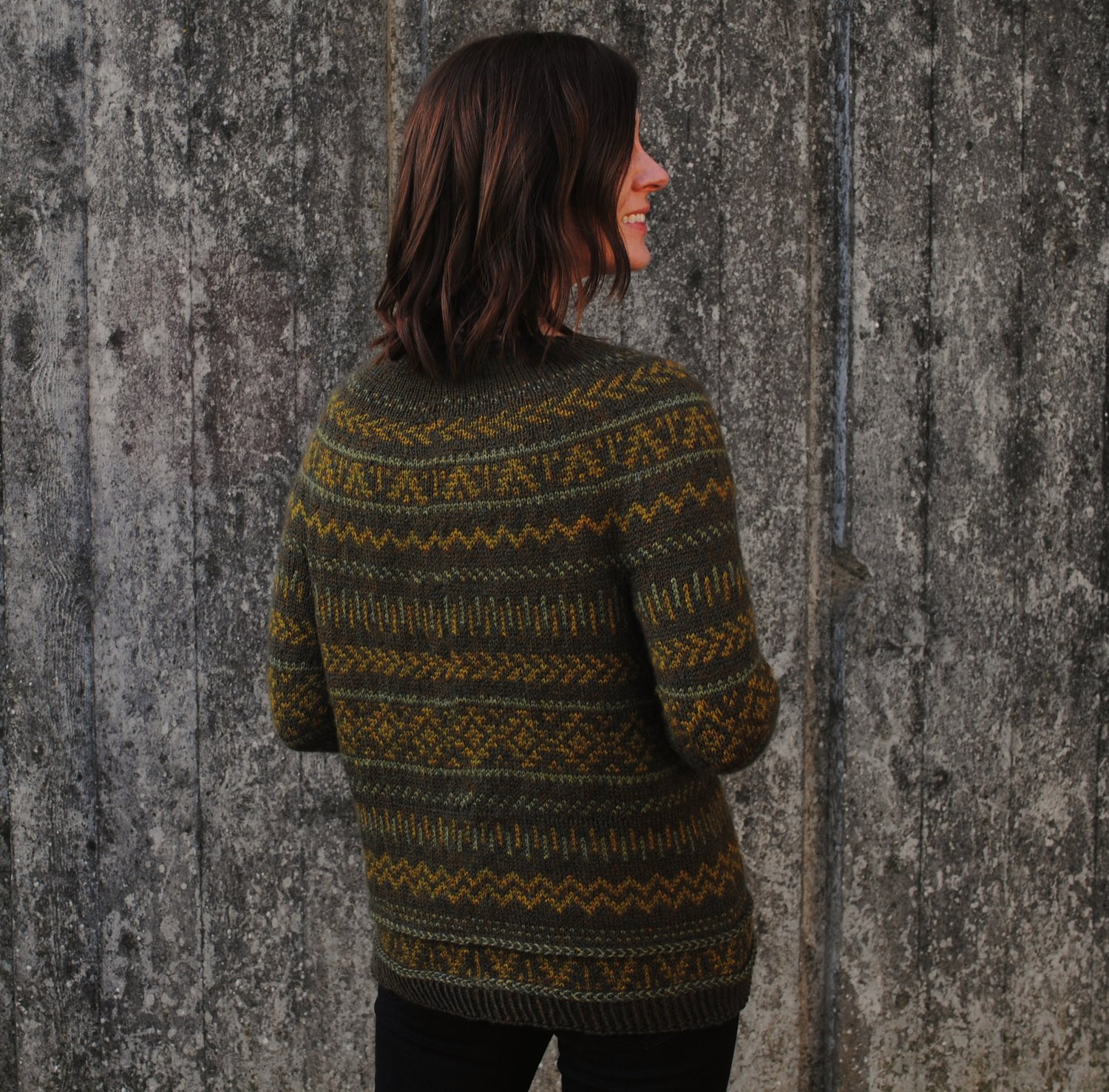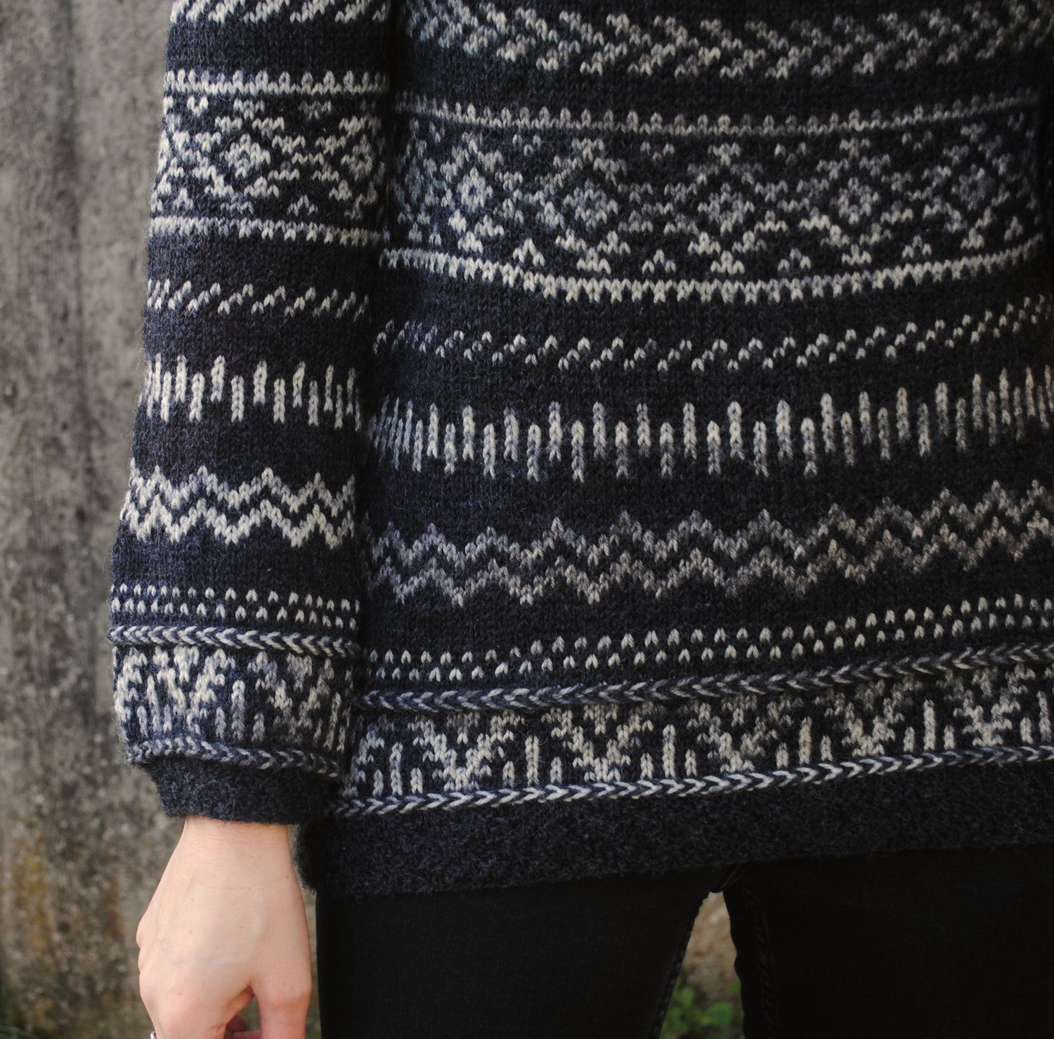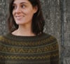 This garment is worked top-down, in the round. After casting on stitches for the yoke, short row shaping is incorporated to optimise fit. The majority of the yoke features sections of stranded colourwork patterns. Once the yoke is completed, stitches are separated into body and sleeves, which are each worked separately and in the round. Stitches for the neckband are picked up and worked in the round.