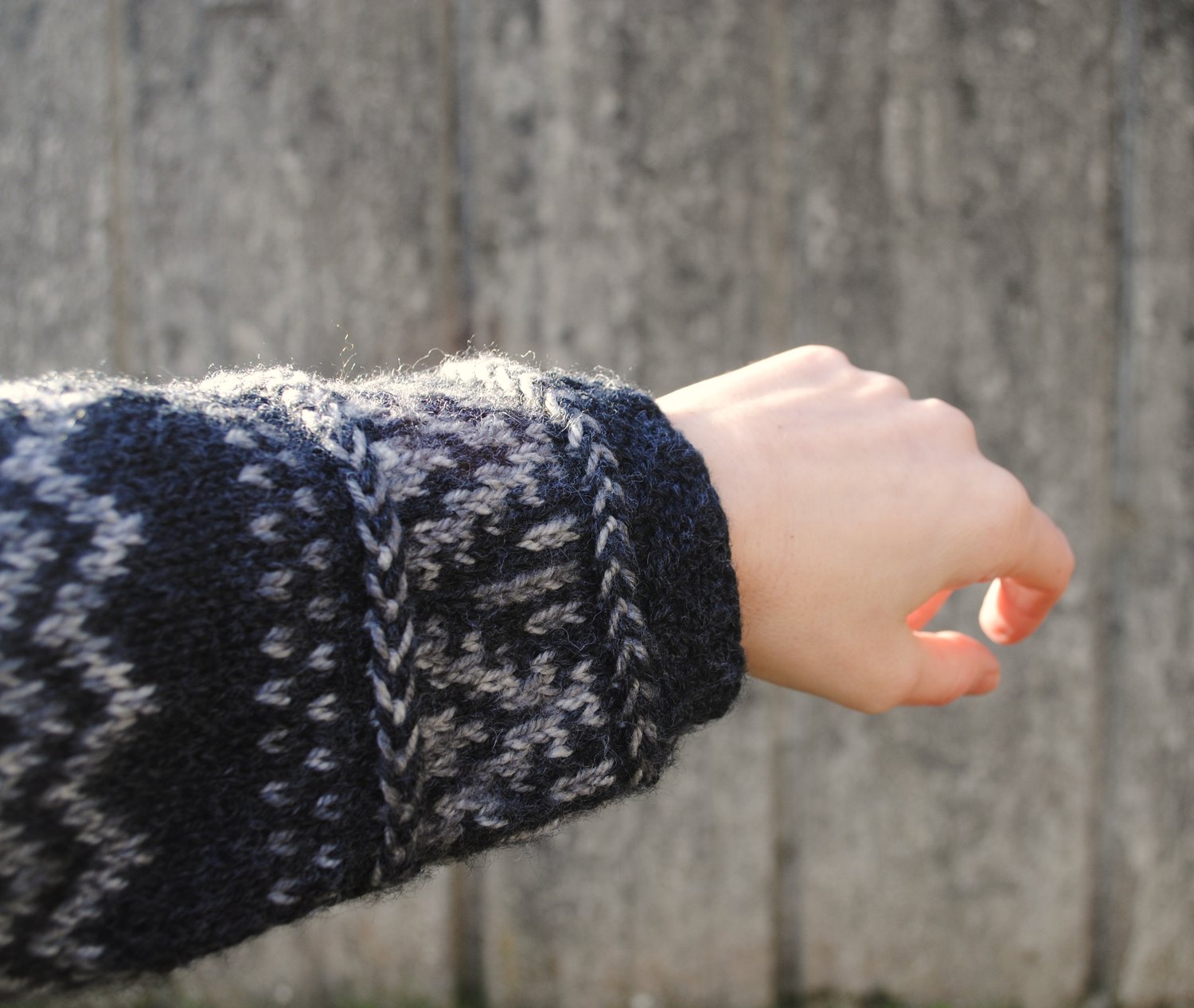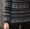 The black and white sample has also been worked in size L, but with modifications to allow for the height of the wearer. The yoke has been split for body and sleeves after Colourwork 6. For the sleeves, 6 extra stitches have been picked up at the underarm to work the sleeves as for size XL. The sleeves have been lengthened by working 5 rounds between each colourwork section instead of 4.