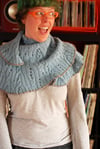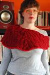 This pattern is for any weight yarn! (Except it won’t be able to get very large with weights lighter than worsted.) This cabled shawl design is worked outwards, starting at the top center, with increases bringing it out into a curved U-shape, and can be worked either until it’s just the size you want, or until you run out of yarn. The bind-off can come at any row, and can be worked in a different colored yarn, both for a contrasting edge design feature, and to help every last bit of yarn get used up.