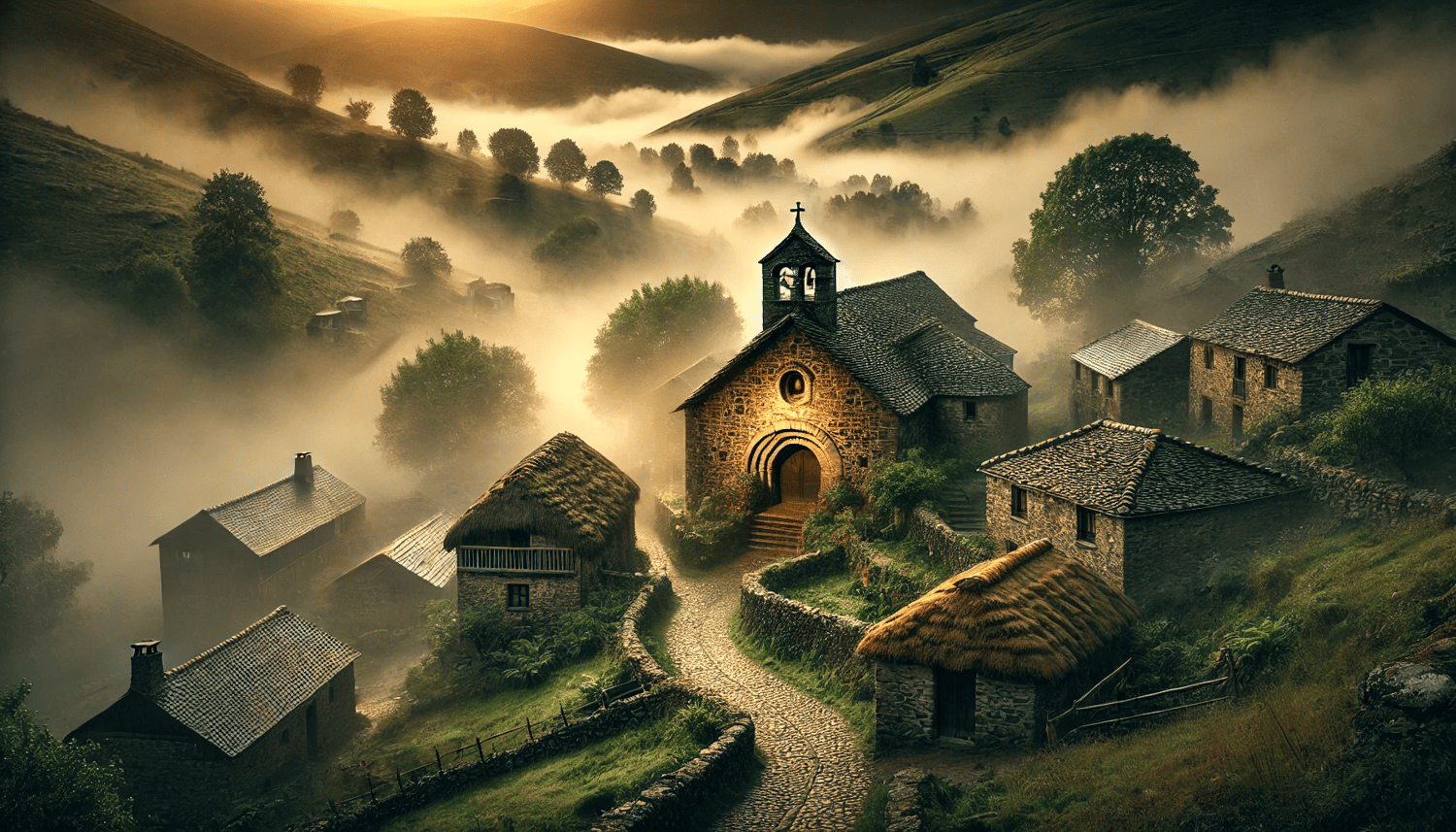 The iconic thatched-roof stone houses stand as silent witnesses to the countless pilgrims who have passed through, reflecting on their transformation and seeking a deeper connection with the divine. This ethereal composition invites the viewer to step into the legends of the past, where ancient spirituality and Christian devotion intertwine.