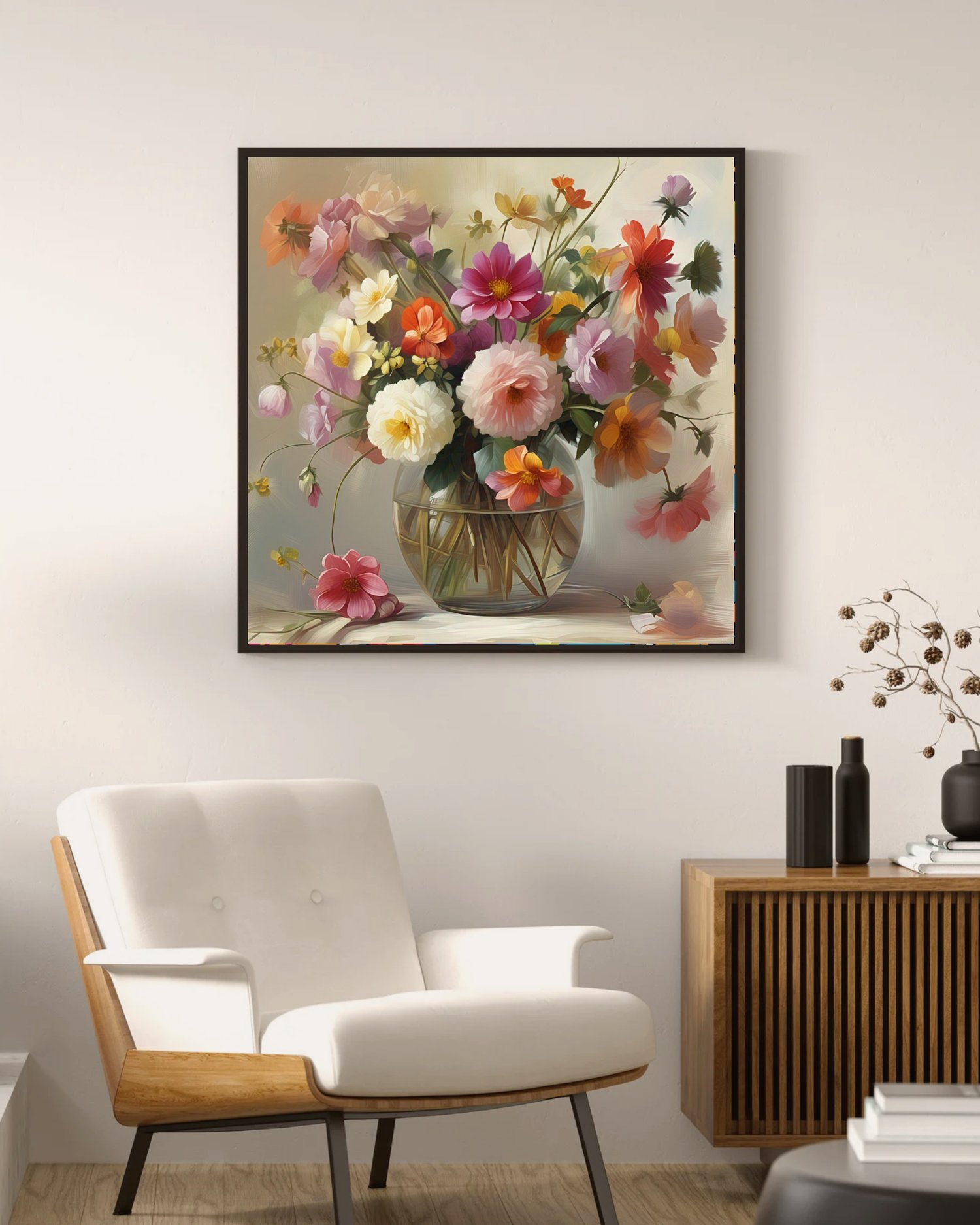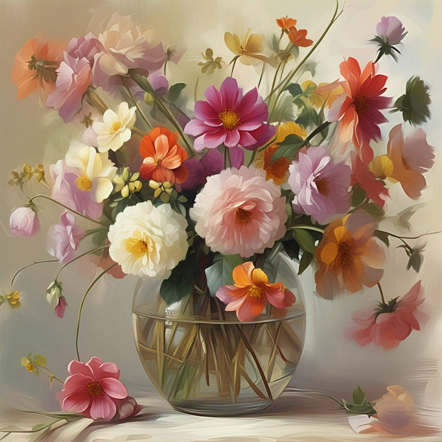This lush artwork captures a generous, romantic bouquet of flowers, rendered with the soft, blended texture of an oil or acrylic painting. The flowers explode outward from a clear, rounded glass vase, creating a vibrant, yet harmonious cluster of color. The palette is dominated by pastel pinks, creamy whites, soft lavenders, and gentle oranges, giving the entire composition a delicate, vintage glow. The visible brushstrokes emphasize the lush, abundant texture of the petals, making the arrangement feel rich and alive. This piece successfully evokes a feeling of opulent natural beauty and timeless, gentle romance, as if the viewer is enjoying a perfect moment of spring indoors.