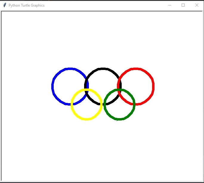 The Python script will use the turtle module to draw the Olympic logo, which consists of five interlocking rings. Each ring is a circle drawn in a specific color and position, according to the Olympic symbol design.