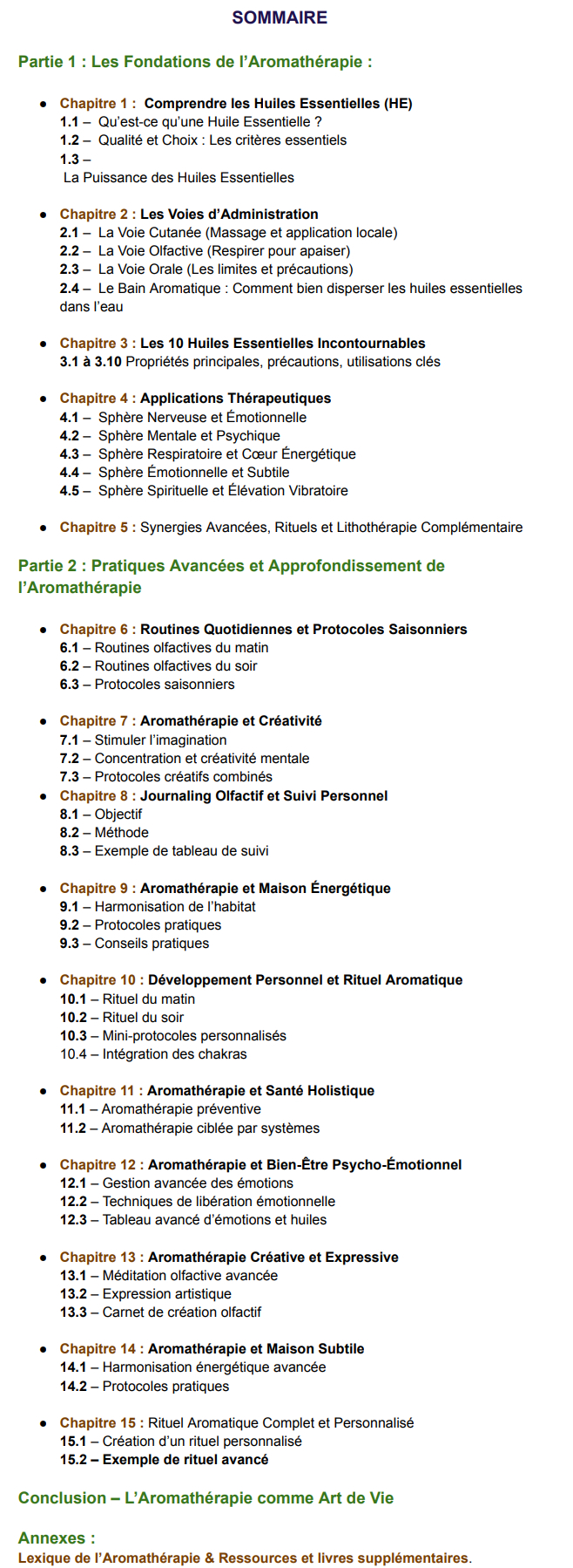 - Les Rituels Transformateurs : Intégrer l'aromathérapie dans des routines quotidiennes, du Journaling Olfactif à l'harmonisation de votre espace de vie.