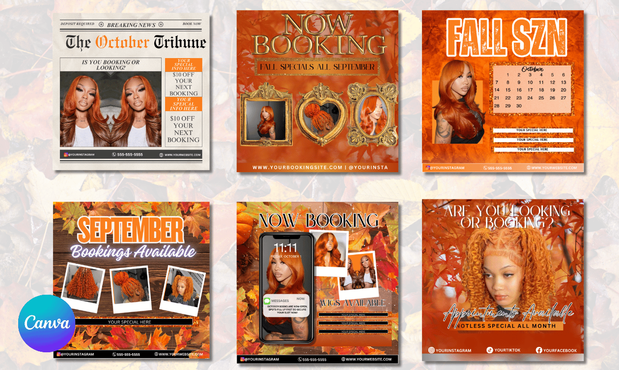 This flyer makes it simple to announce “Now Booking” and get your calendar filled fast. 🍁 Whether you’re promoting wigs, makeup, lashes, or skincare – this fall-themed design will help your business stand out and shine.