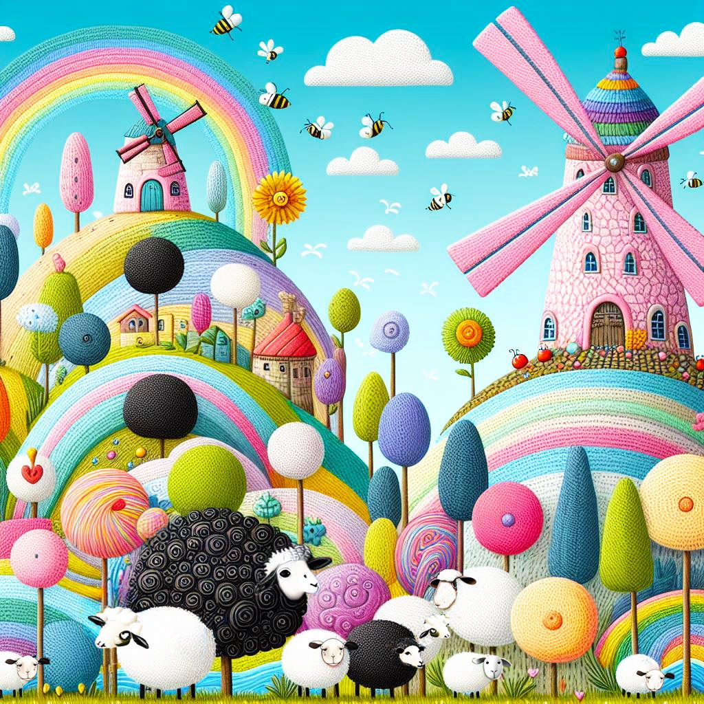 Lots of sheep on tall patterned hills with rounded houses. There is a colourful windmill & giant sized flowers with big bees. There is a pond with purple water, tall bendy trees, a rainbow, Patchwork knitted style.