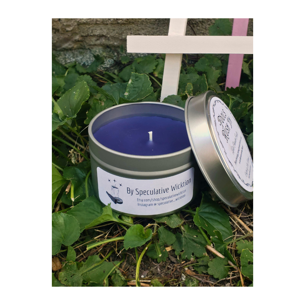 A 4 oz. character themed candle by Alec J Marsh. The Leslie candle is a plum brandy, pomegranate bitters, and cardamom/anise blend.