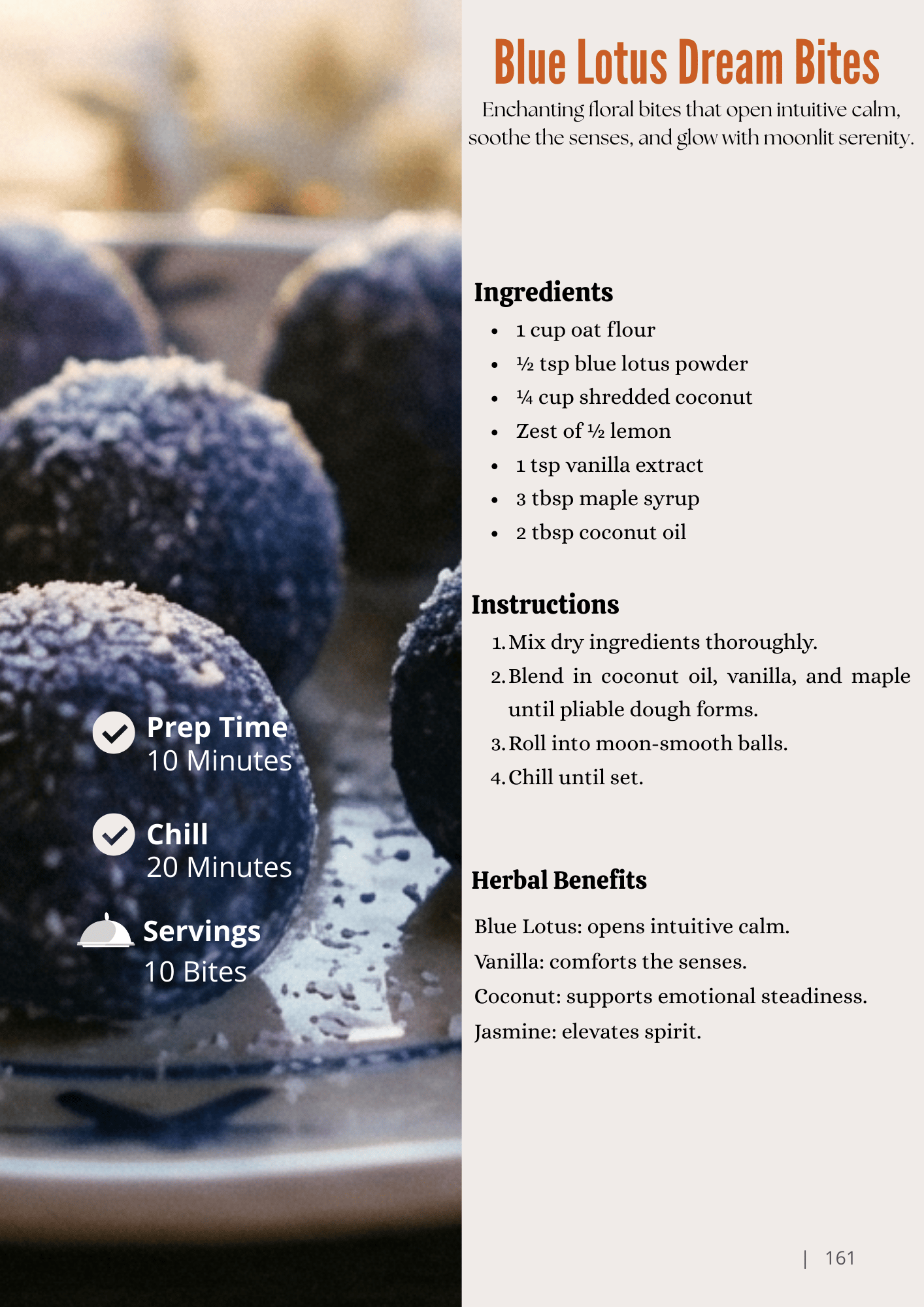 Example recipes include offerings like Lunar Calm Bars softly sweet, grounding herbal snacks crafted to calm the mind and encourage deep rest.