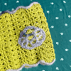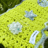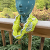 A cozy crochet cowl with a lacy pattern and scalloped edges. The main color of this design is neon green, bordered with a pastel multicolor yarn. Around the center, there is a row of different applique designs to represent the life cycle of a cicada, from eggs (a cluster of loops and handsewn beads), to hatching (a star shape), to molting (a skeletal wing).
