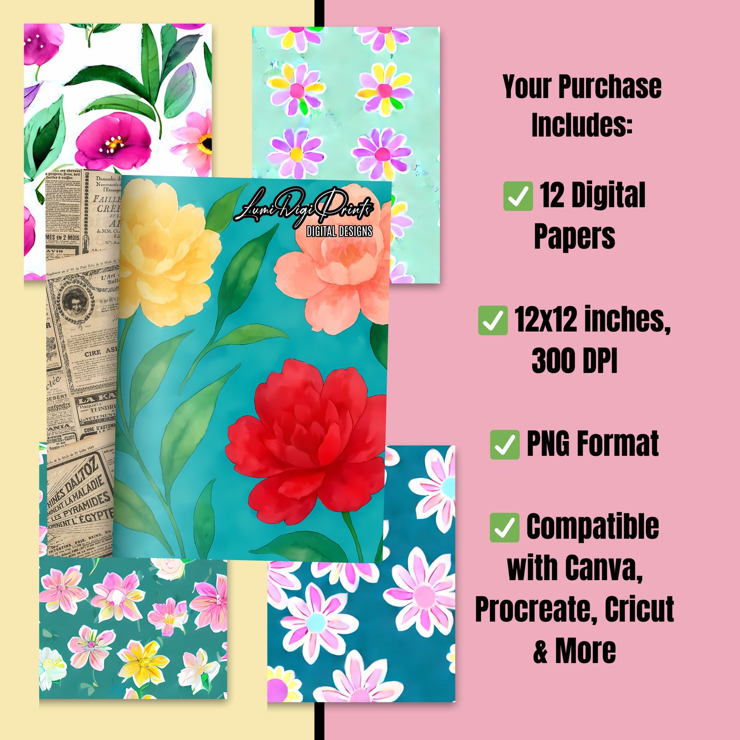 This versatile bundle includes 12 watercolor floral patterns, designed to add a soft, artistic touch to everything from journals and scrapbooks to print-on-demand products and home décor.