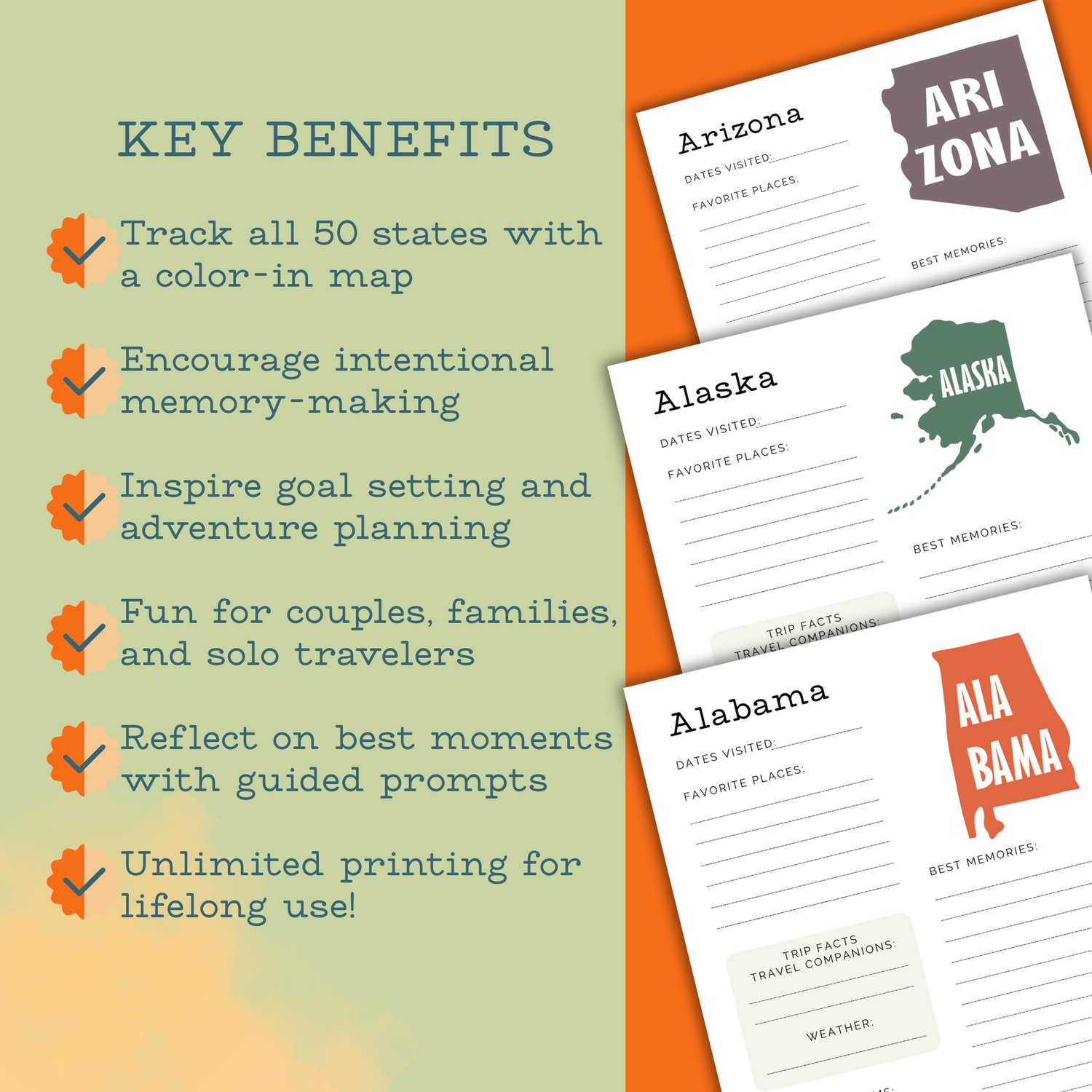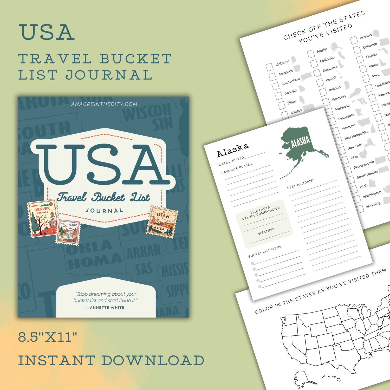 Whether youβre on a mission to visit all 50 states or love documenting special vacations, this printable journal is a must-have keepsake for your travel binder, scrapbook, or planner.