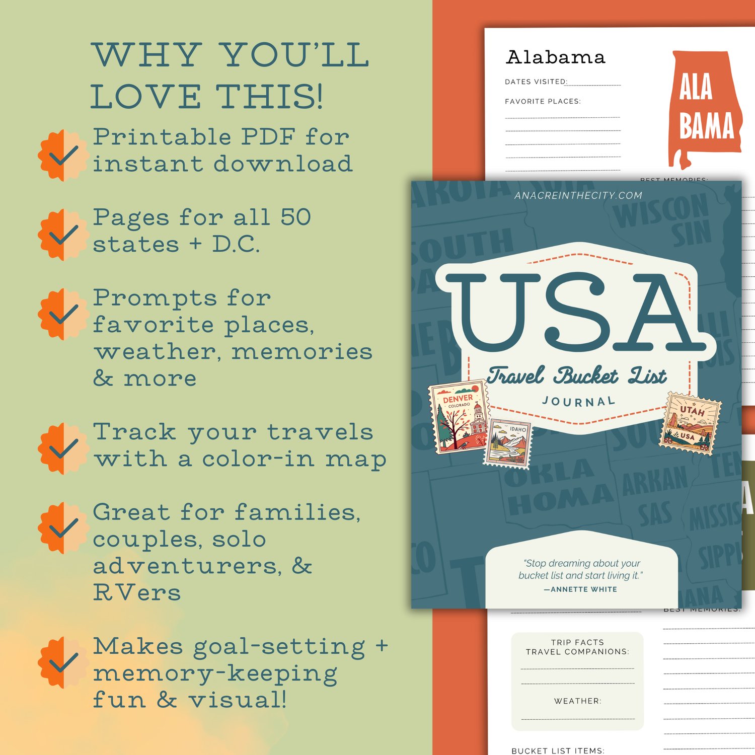 USA Travel Journal Printable | Bucket List States Tracker | Road Trip Memory Book | Digital Travel Planner