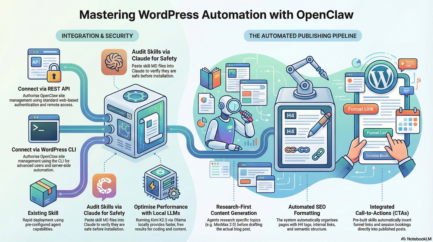 This guide teaches you how to connect OpenClaw, Claude, and local LLMs with WordPress to automate research, content creation, SEO formatting, and publishing—all while maintaining security, speed, and control.