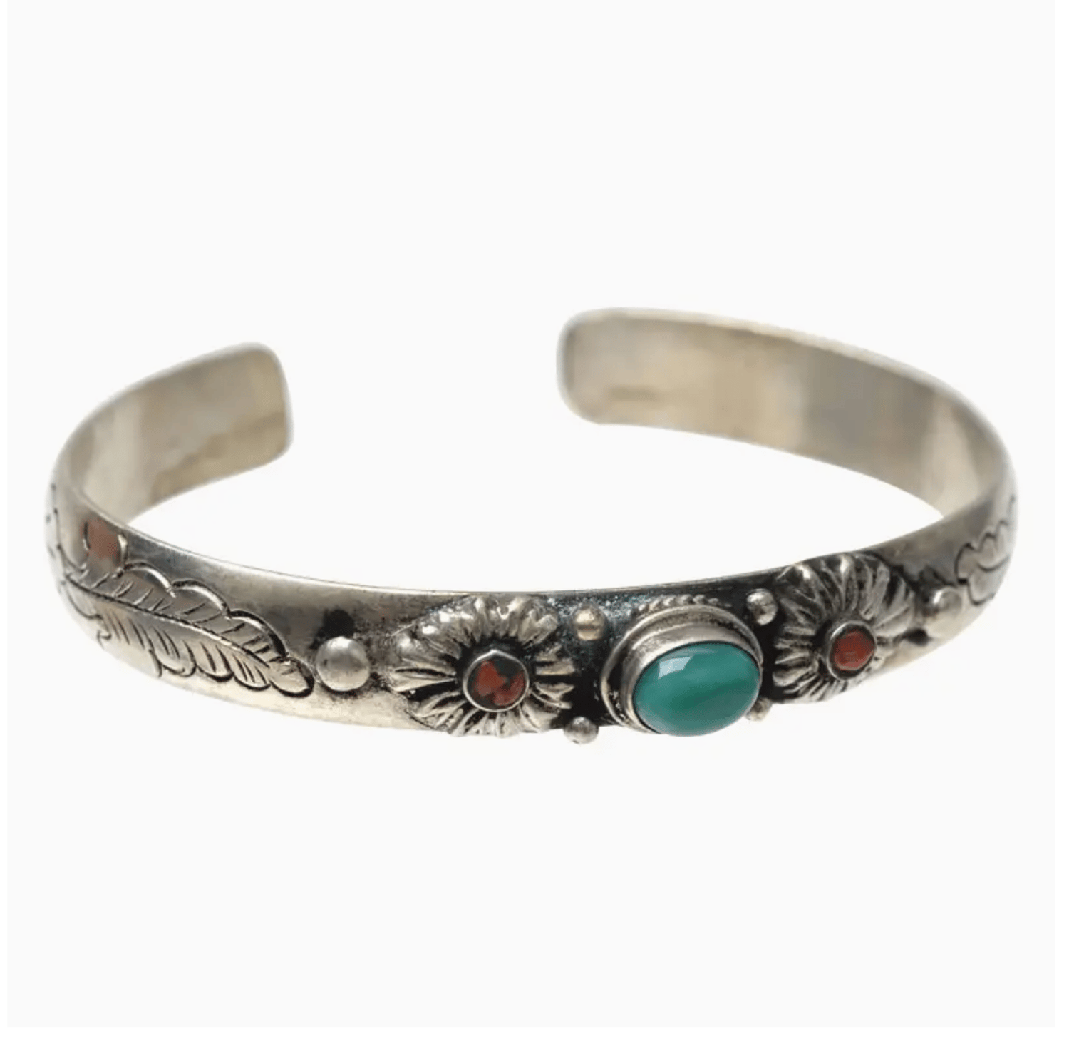 Our Silver Turquoise Flower Cuff Bracelet is a stunning statement piece that blends timeless elegance with natural beauty. Featuring a vibrant turquoise flower centerpiece, this cuff is fully adjustable to comfortably fit any wrist. Perfect for layering or wearing alone, it brings a touch of bohemian charm and earthy energy to any outfit.