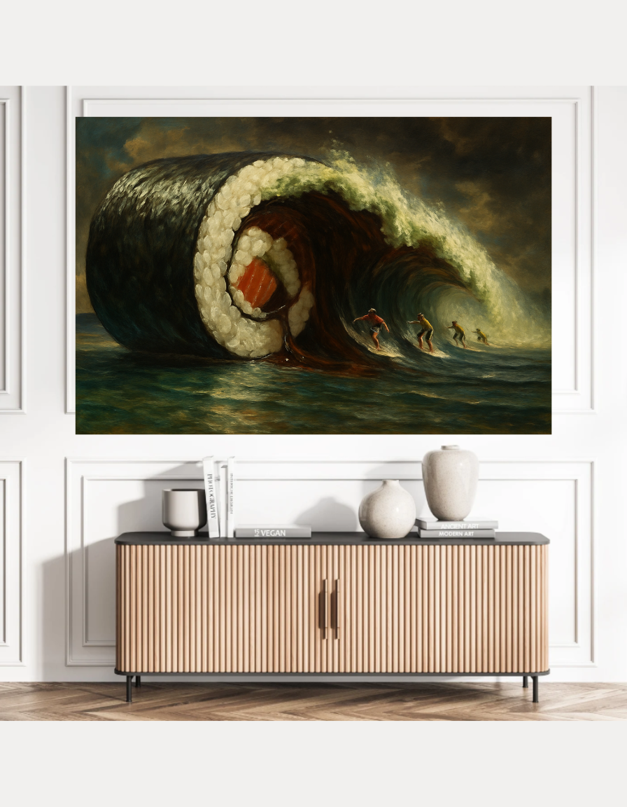 Whether you're searching for surreal food art, great wave parody prints, or funny ocean-themed wall decor, this piece adds a splash of creativity to any space. Download now and bring the sushi wave to life!