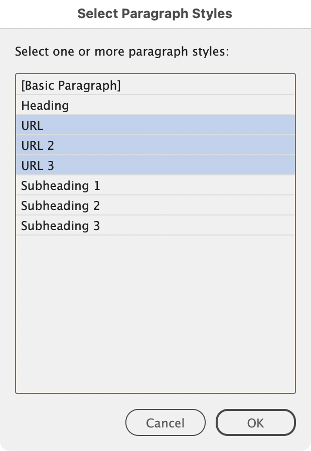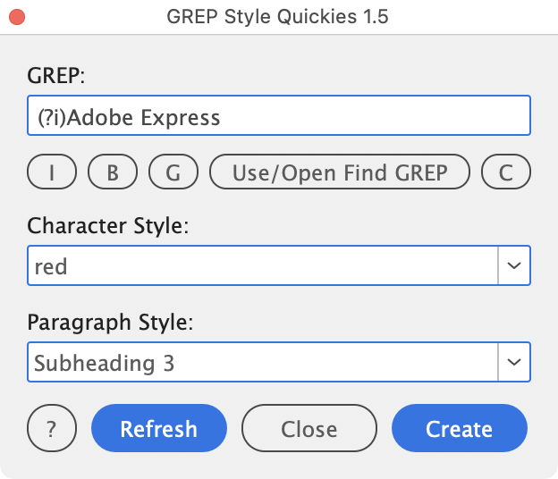 • Use/Open Find GREP: Imports expression from InDesign’s Find/Change dialog.