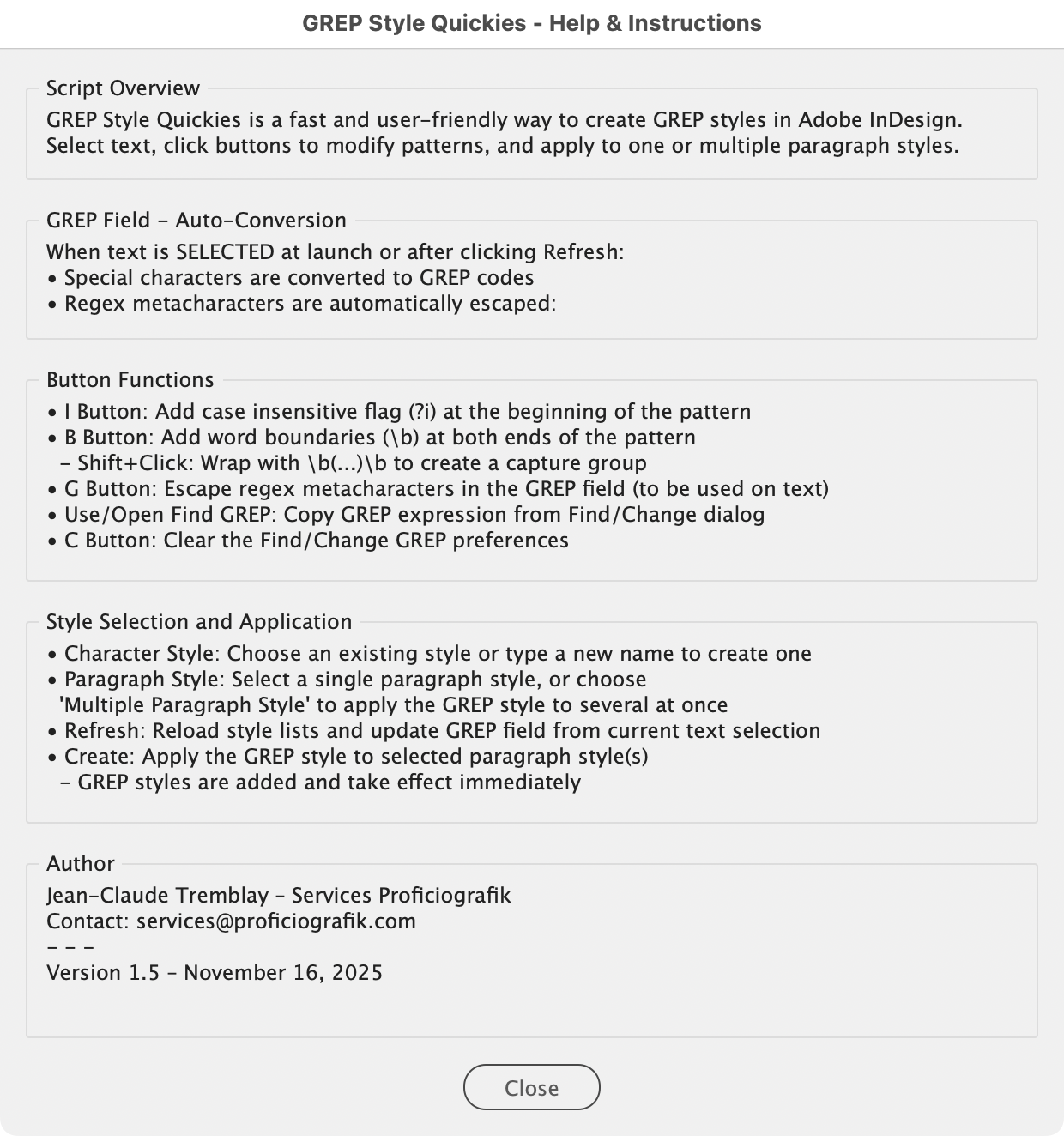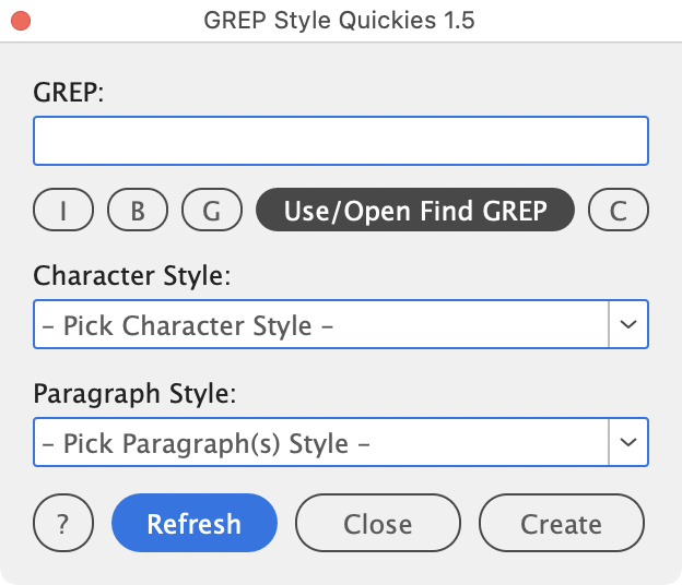 GREP Style Quickies is a tool designed to simplify and speed up the process of creating GREP styles in Adobe InDesign. Instead of navigating through InDesign’s complex menus, this script provides a user-friendly interface that lets you create and apply GREP styles in just a few clicks.