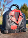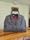 A motorcycle jacket inspired bag. The front features two functional zip pockets, and a faux patch pocket. The jacket portion itself can be used as another pocket. There is also a "secret" pocket behind the jacket front. The interior offers a third inset zipper pocket.