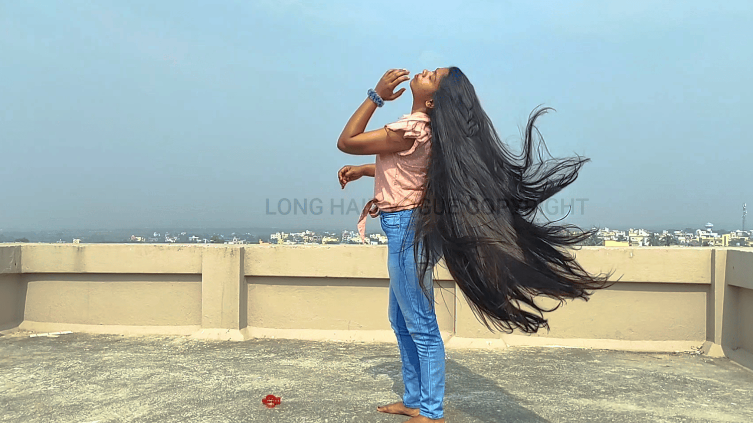 Under the open sky, a radiant Indian woman embraces the breeze as she plays with her voluminous, long black hair on a serene rooftop. From tender hair play to an elegant bun drop, every moment captures the timeless connection between nature and beauty.