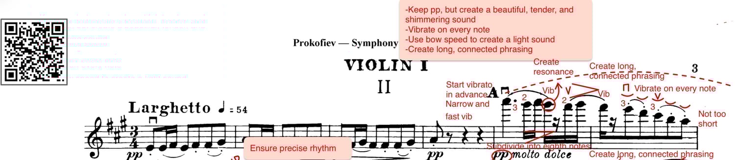 Each excerpt includes my personal bowings, fingerings, phrasing, musical ideas, audition tips, and practice strategies — refined through years of performing and auditioning with top orchestras.