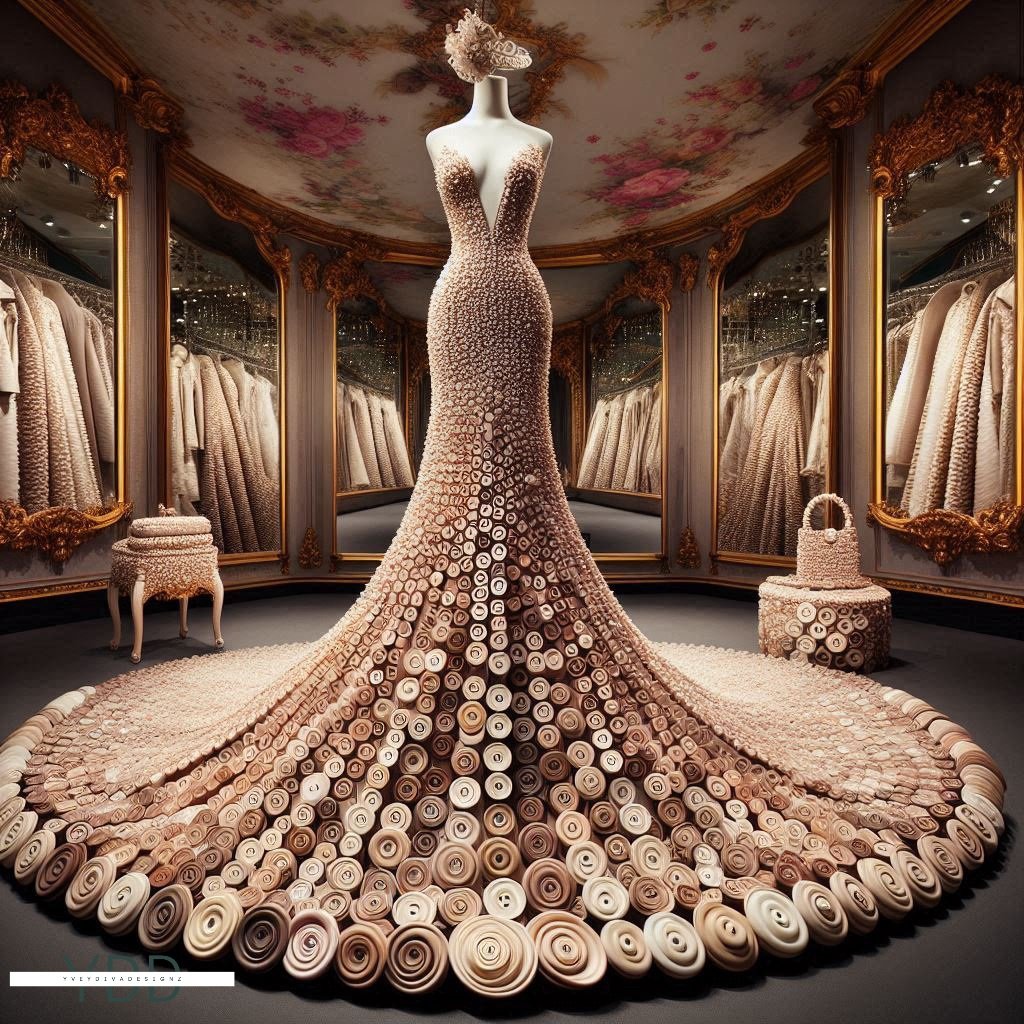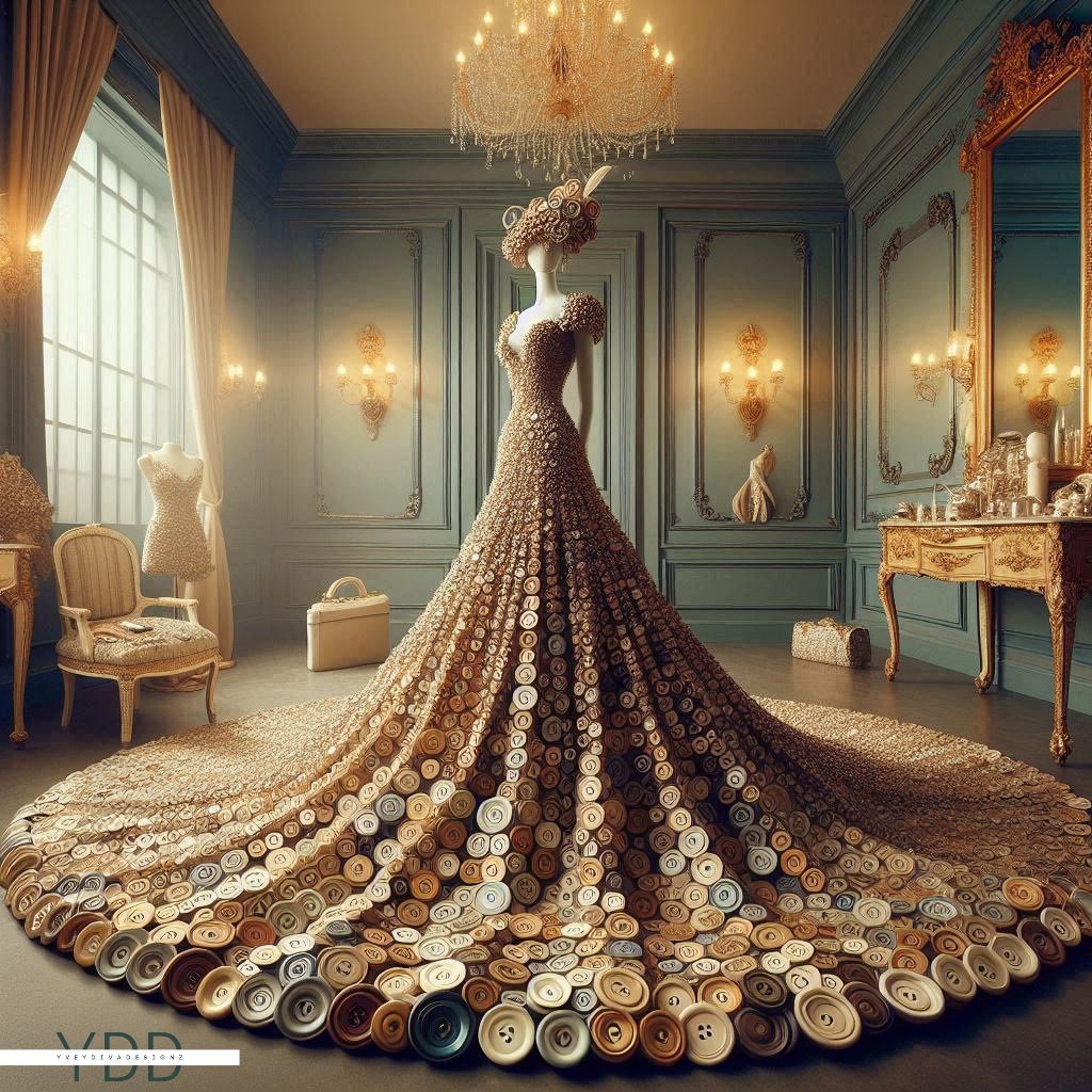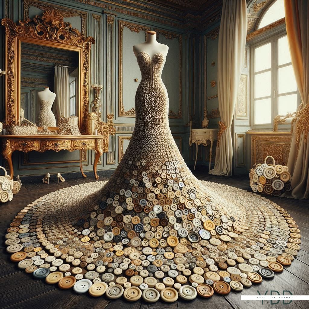 "Buttoned Elegance: Couture in Spirals" is a captivating art series showcasing exquisite couture dresses crafted entirely from intricately arranged spiral buttons. Each dress embodies a unique blend of sophistication and creativity, with the buttons forming elegant patterns and textures. This collection highlights the artistry in fashion design, transforming everyday objects into stunning, wearable masterpieces.