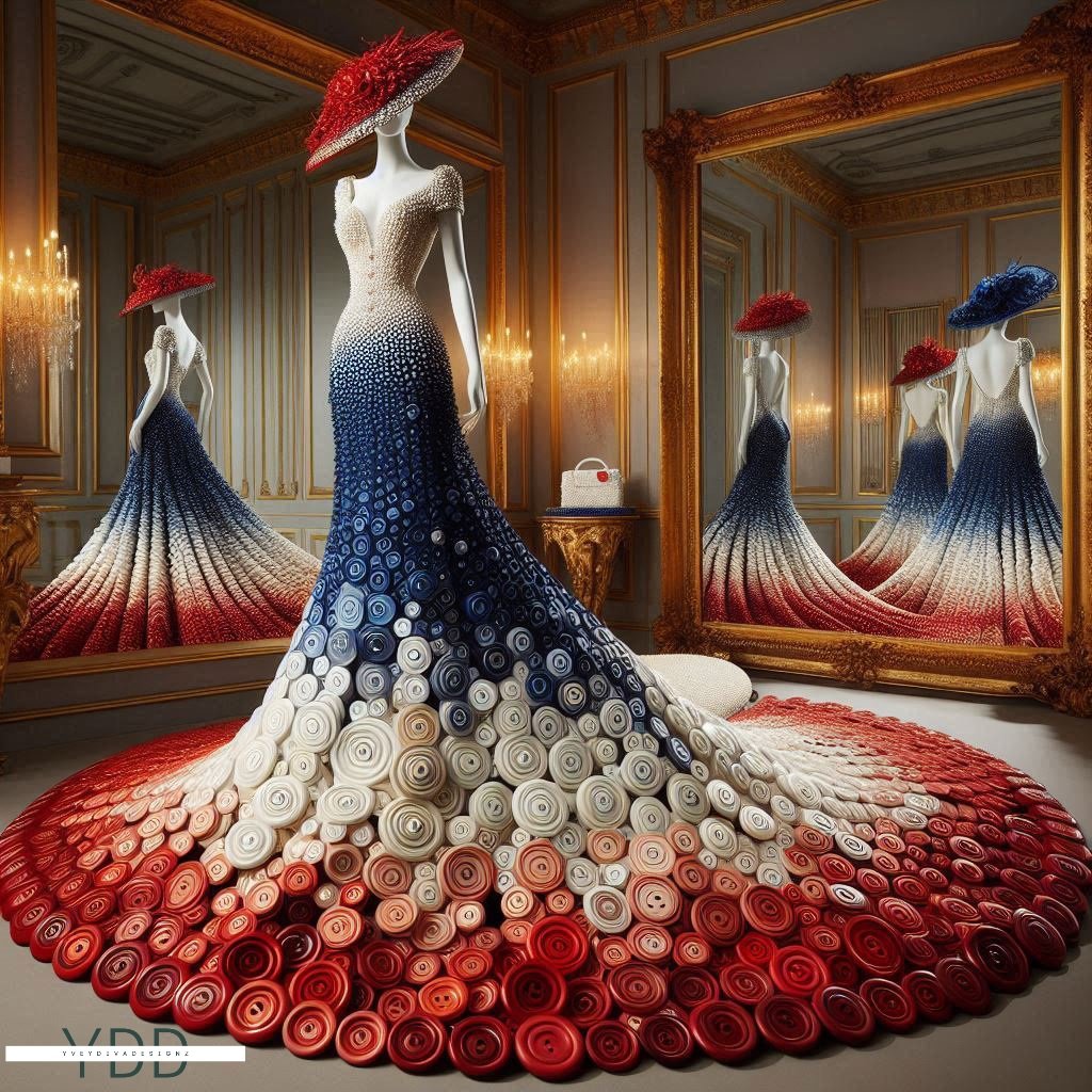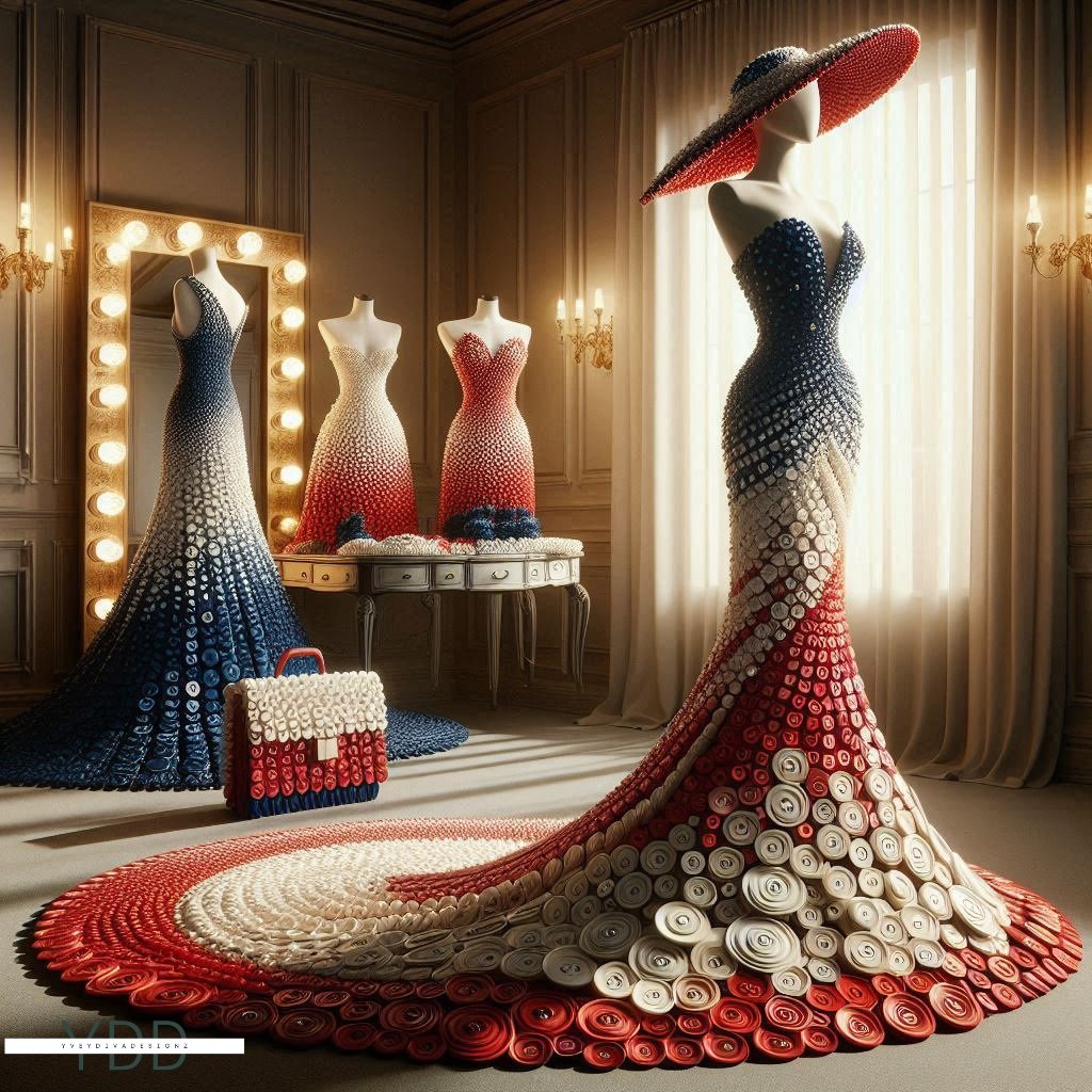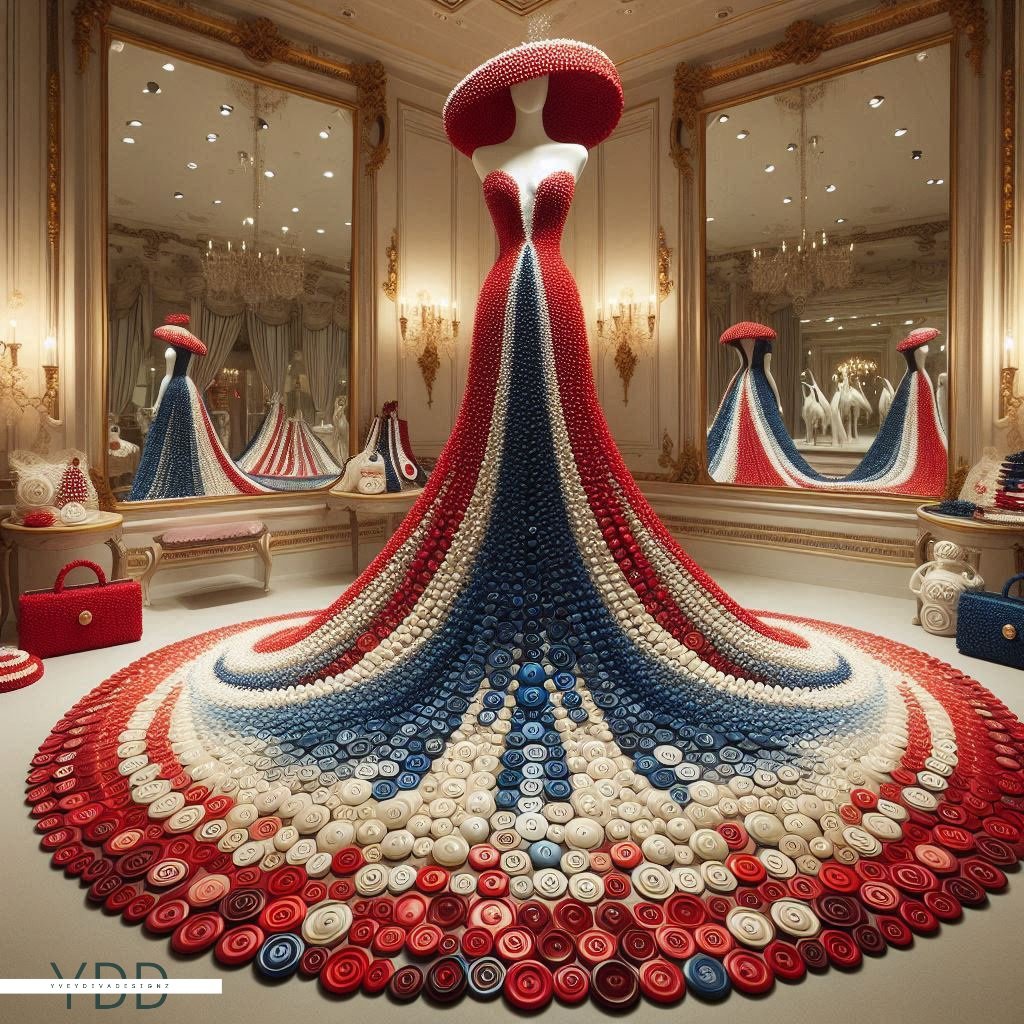 "Buttoned Elegance: Couture in Spirals" is a captivating art series showcasing exquisite couture dresses crafted entirely from intricately arranged spiral buttons. Each dress embodies a unique blend of sophistication and creativity, with the buttons forming elegant patterns and textures. This collection highlights the artistry in fashion design, transforming everyday objects into stunning, wearable masterpieces.