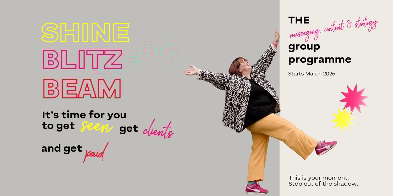Join me in SHINE, BLITZ, BEAM and over 10 weeks, we’ll bring your words, content and confidence together so you can be seen, get clients and get paid.