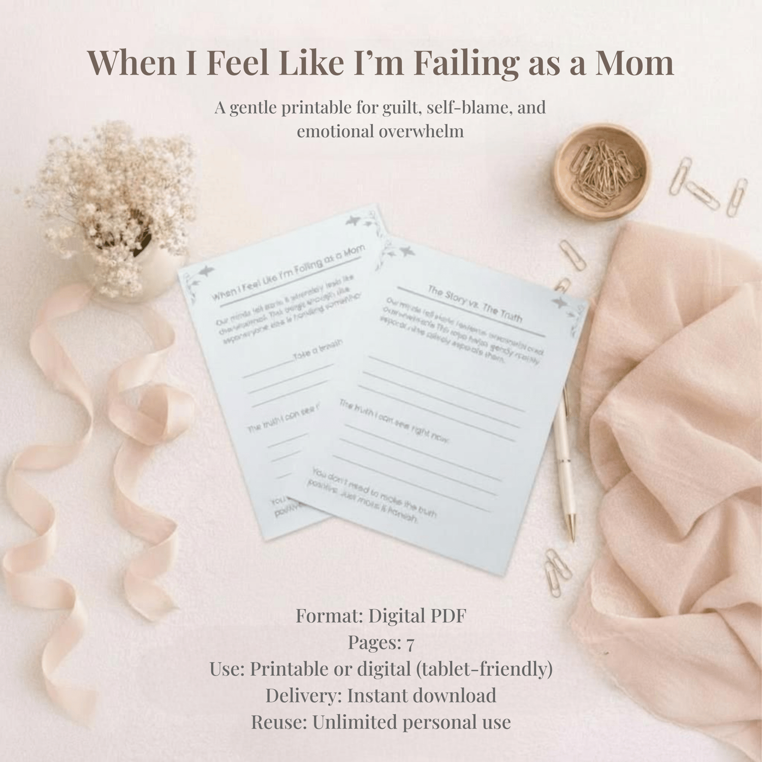 When I Feel Like I’m Failing as a Mom is a calm, supportive PDF designed to help overwhelmed moms release guilt, soften self-criticism, and reconnect with a kinder perspective — without pressure, productivity, or “fixing yourself.”
