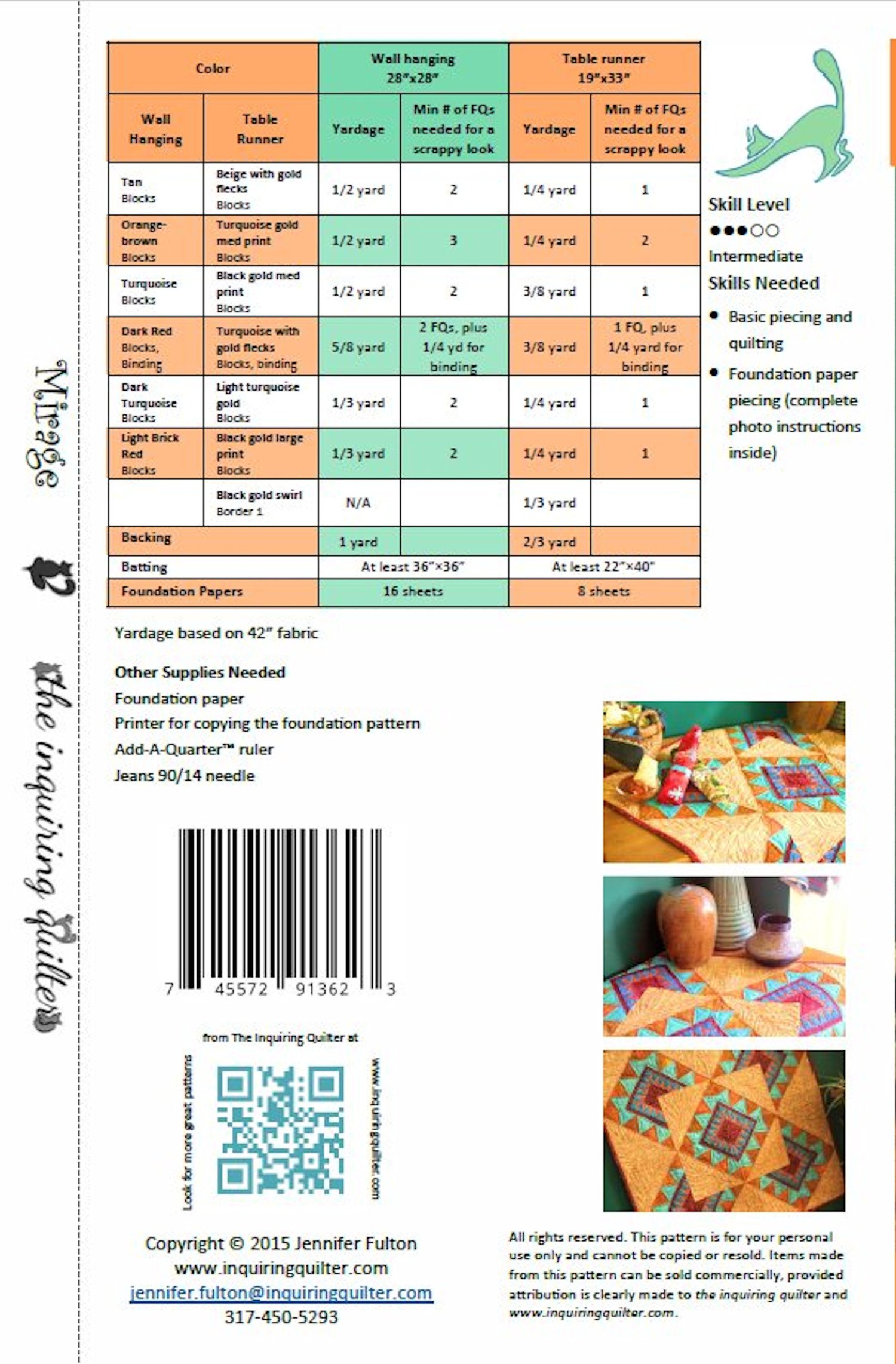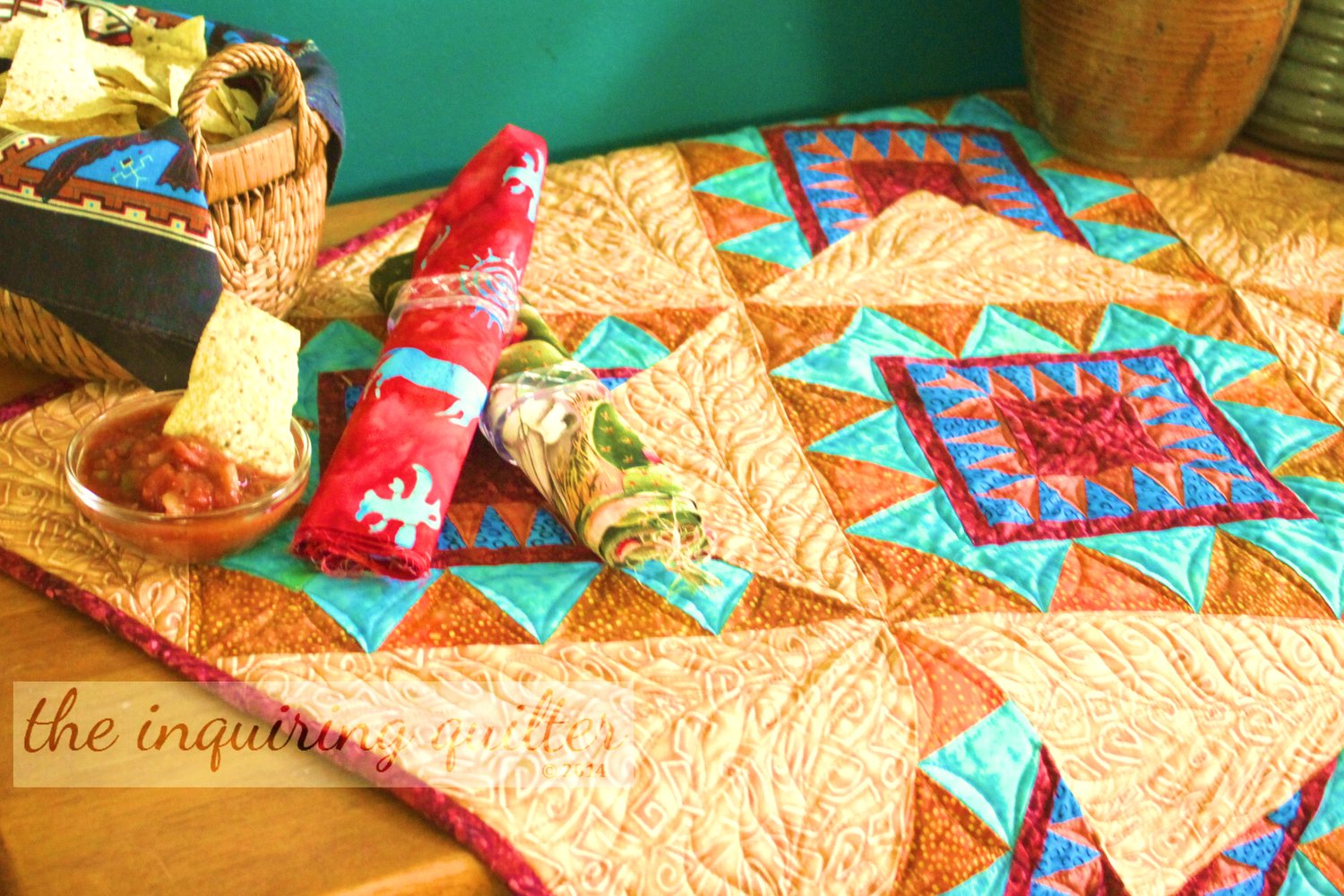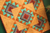 As beautiful as a desert sunrise, Mirage reminds me of Santa Fe, New Mexico with its gorgeous artisan shops and tasty cuisine. As you can see in the table runner example though, you don’t have to favor the colors of the southwest to enjoy this quilt. Mirage is fat quarter friendly, making it easy to achieve the scrappy look featured in the table runner.