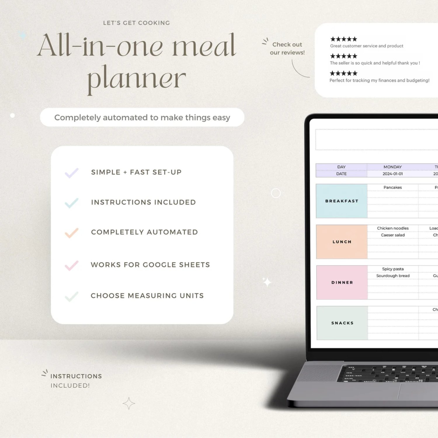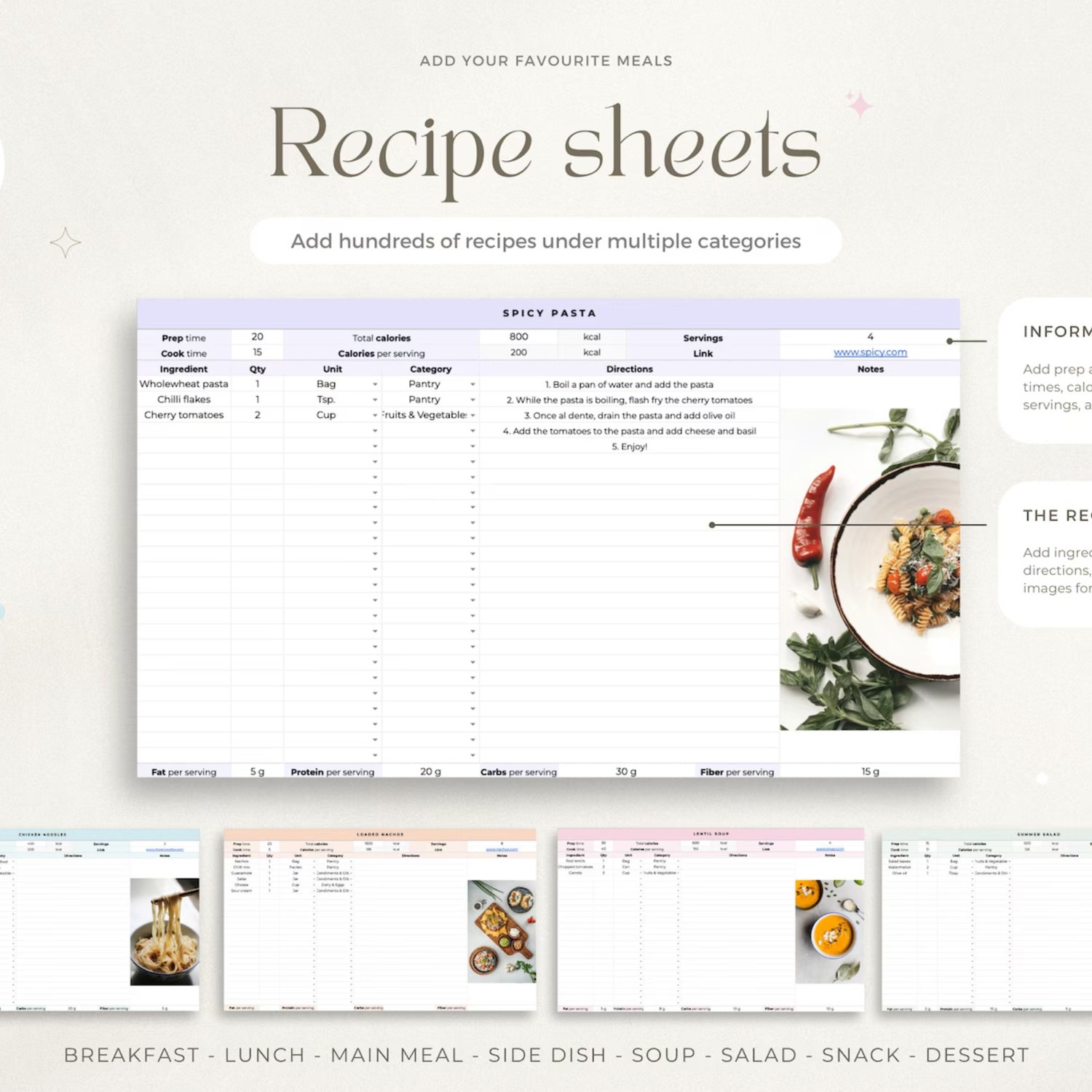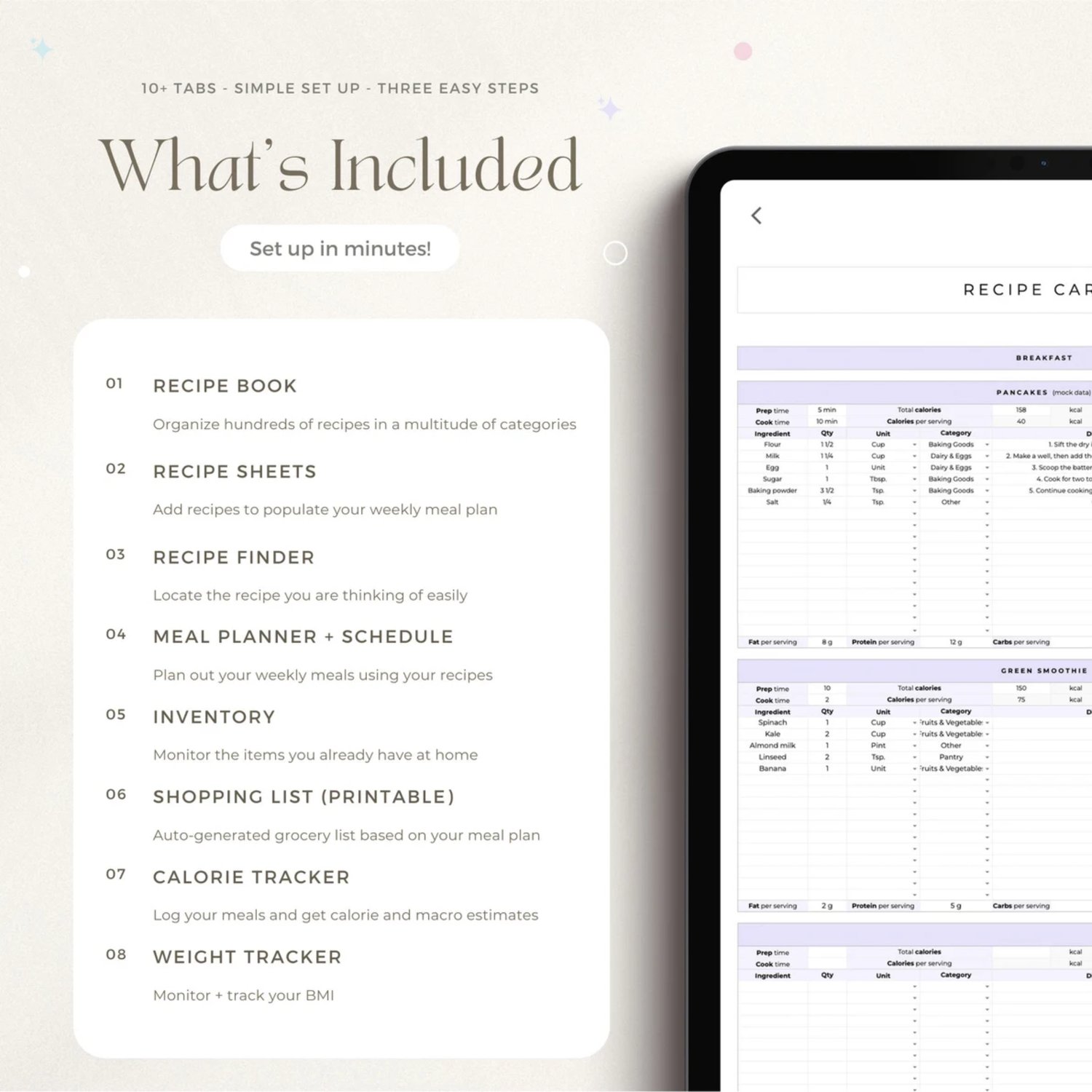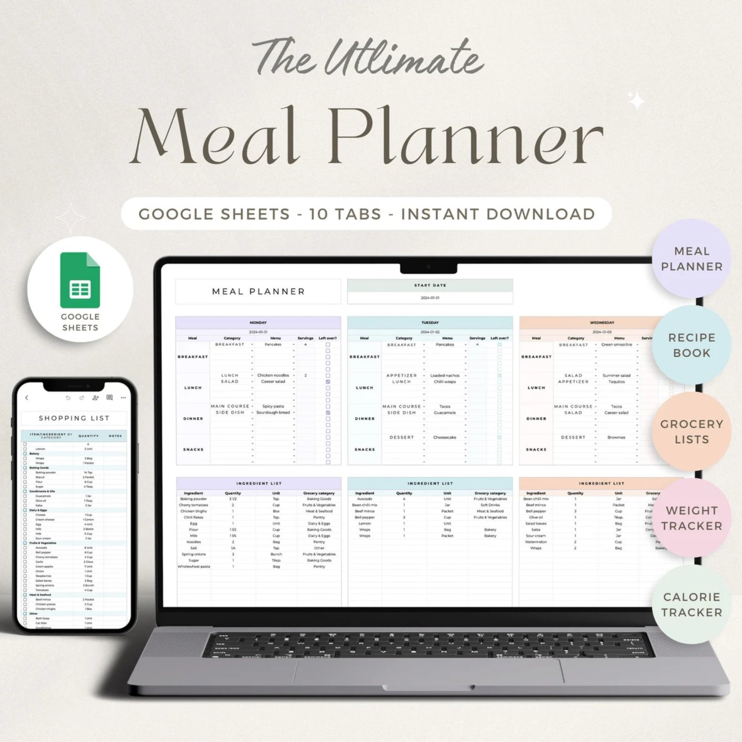 Get organized with our weekly planner spreadsheet for Google Sheets! Create weekly meal plans and add up to 800 recipes in the digital cookbook. The meal planner template automatically generates printable grocery lists and tracks your pantry inventory with ease. Additionally, you can monitor your calorie intake, macros, and weight to maintain a balanced lifestyle.